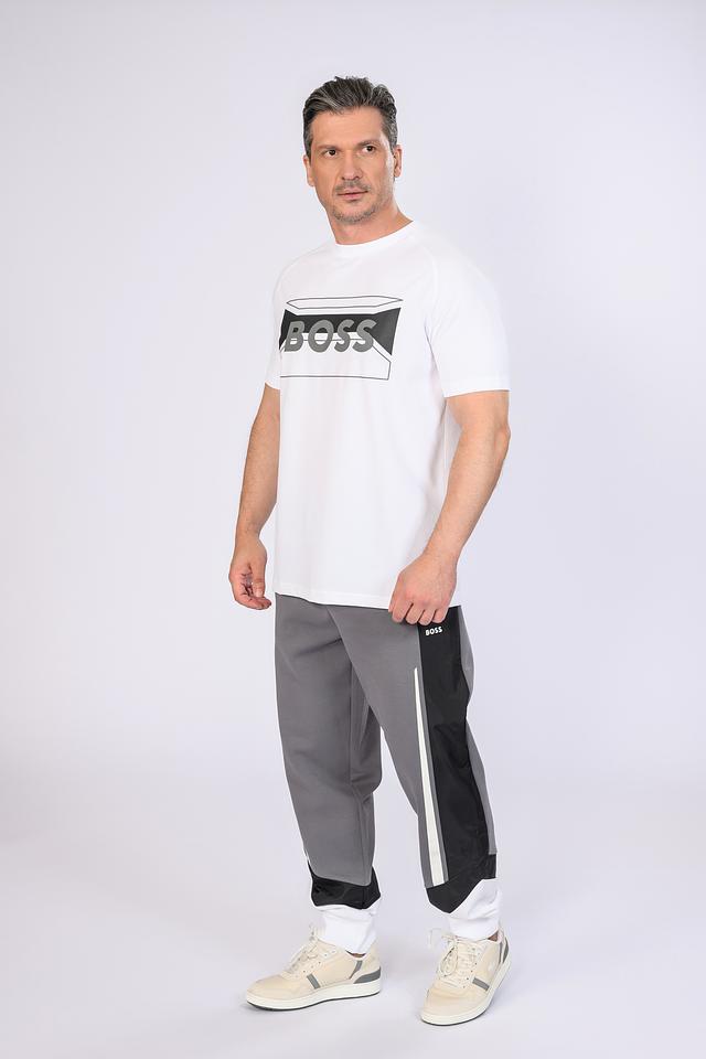 Белая футболка Boss Green с оригинальным графическим принтом логотипа бренда. Изготовлена из комфортного сочетания хлопка, полиэстера и эластана, обеспечивающего удобную посадку и свободу движений. Состав: хлопок 56%, полиэстер 39%, эластан 5%