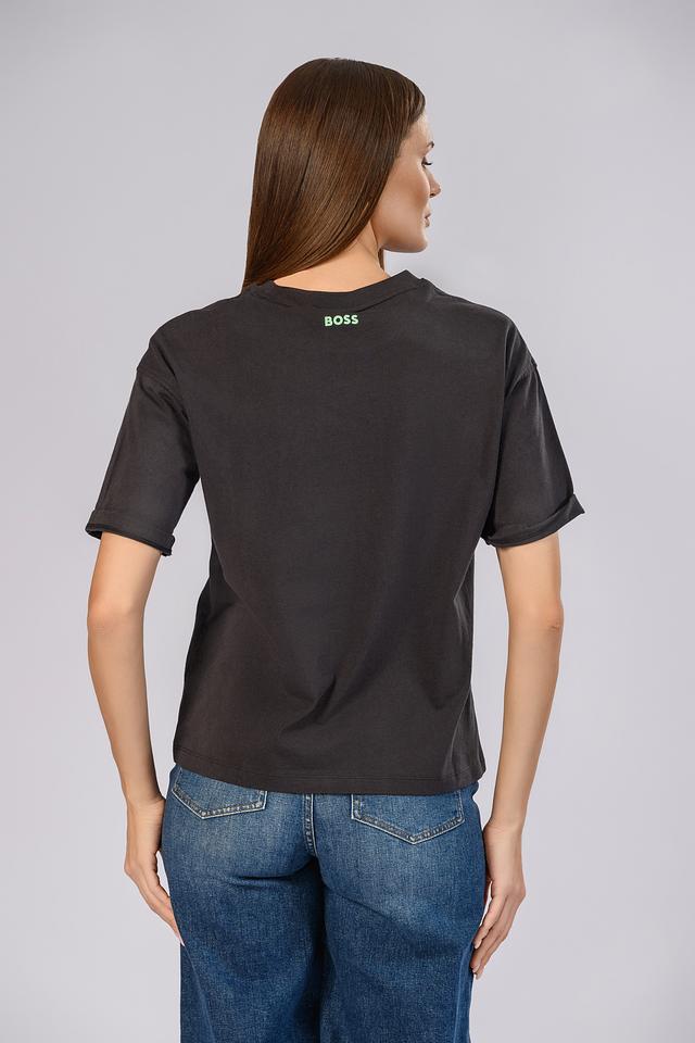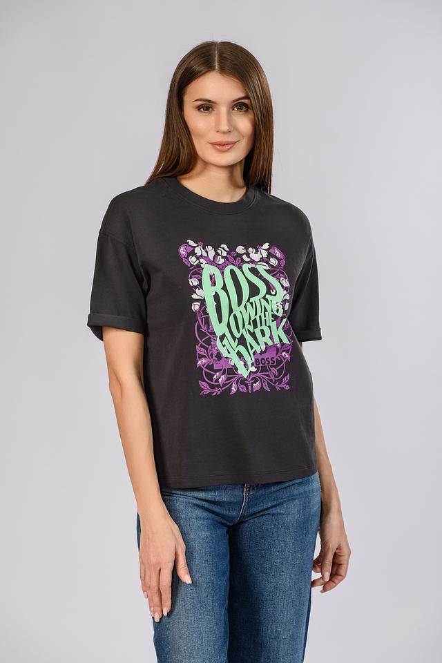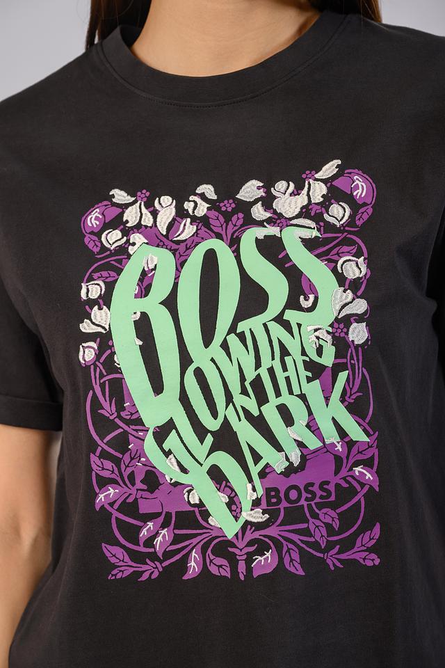 Женская футболка Boss Orange чёрного цвета с ярким принтом "Glowing Dark". Изготовлена из 100% хлопка, обеспечивая комфорт и воздухопроницаемость. Стильный крой и оригинальный дизайн делают эту футболку отличным выбором для повседневного образа. Состав: хлопок 100%