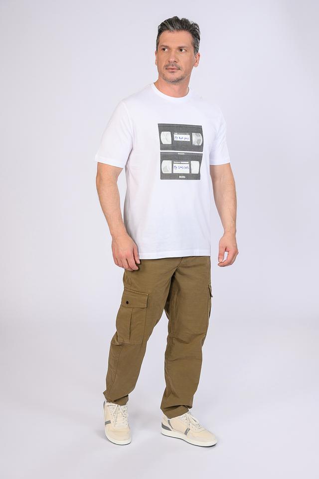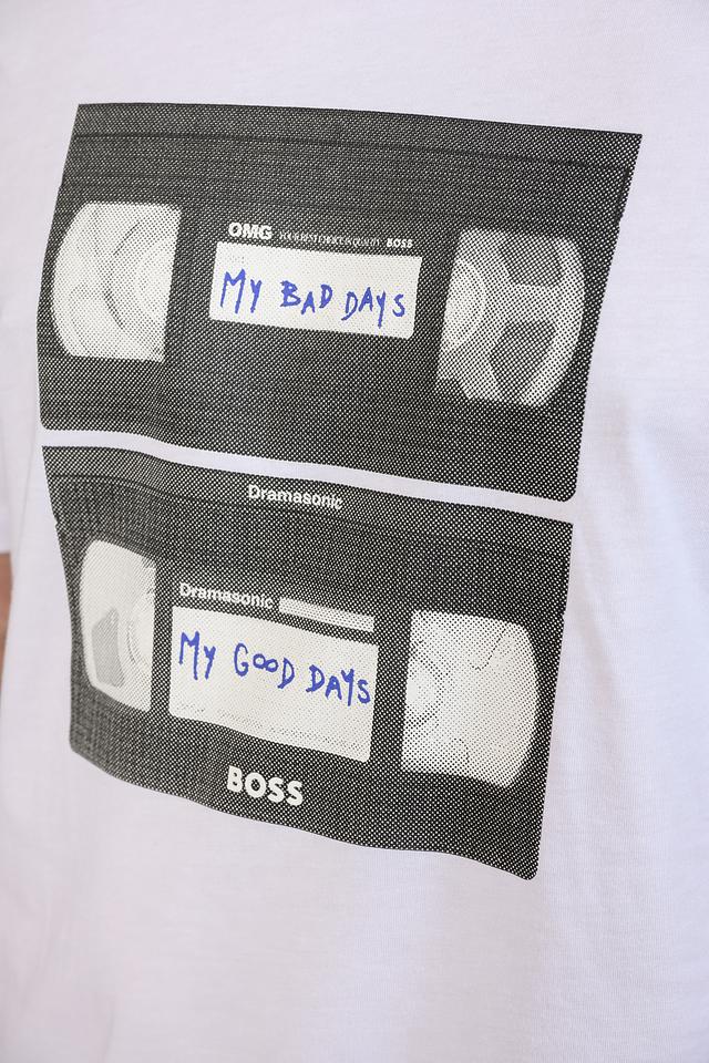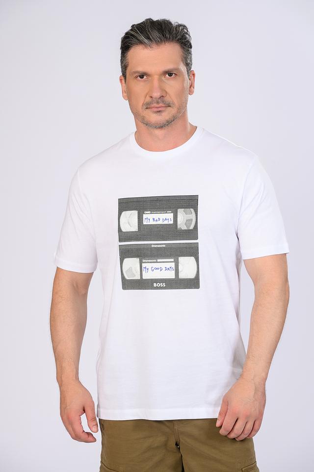 Белая футболка Boss Orange с оригинальным принтом в виде кассет. Изготовлена из 100% хлопка, обеспечивая комфорт и воздухопроницаемость. Стильный и современный выбор для повседневного образа. Состав: хлопок 100%
