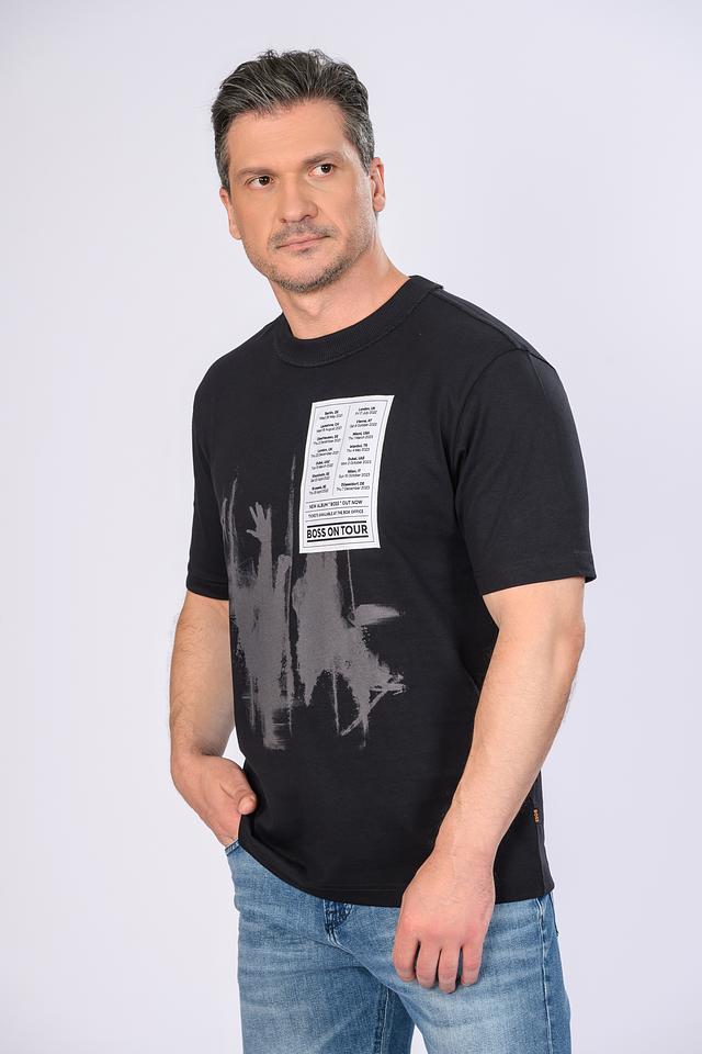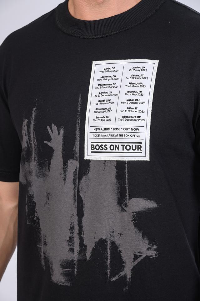 Основным акцентом футболки является яркий принт "Boss on Tour", который включает в себя графические элементы, имитирующие билеты на концерты, и логотип бренда. Принт выполнен в серо-белой гамме, что создает контрастный и запоминающийся образ.