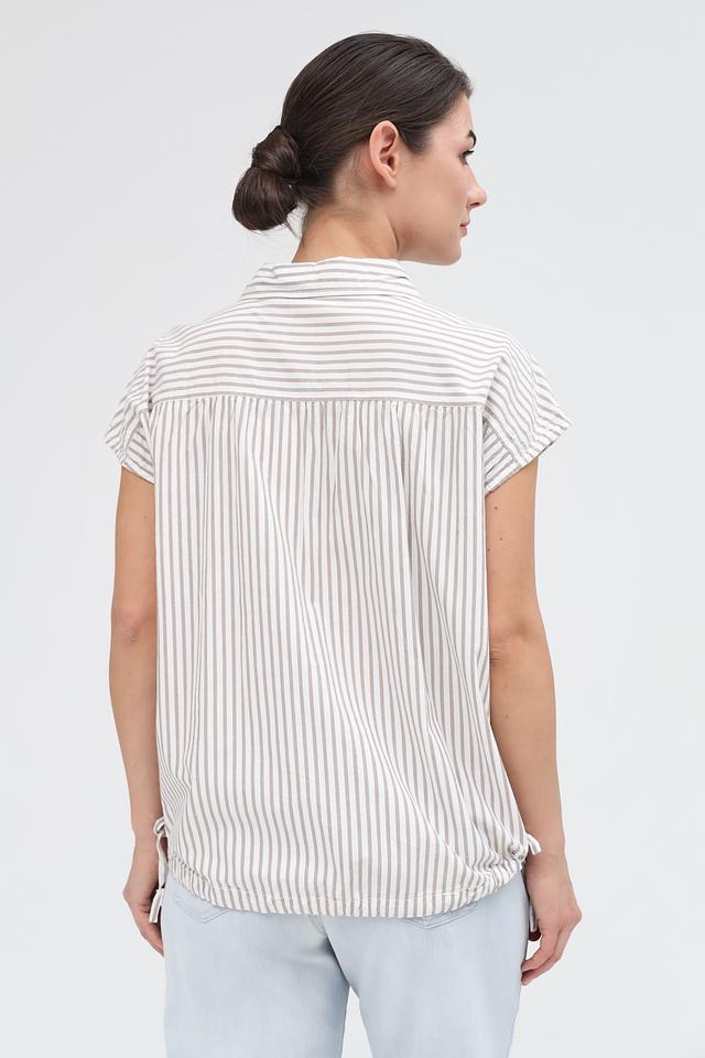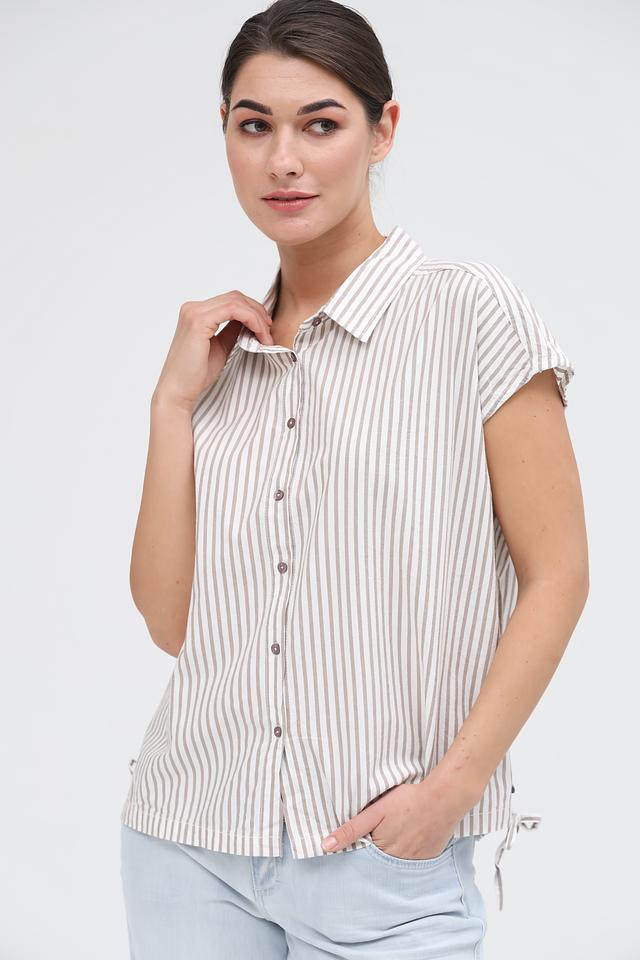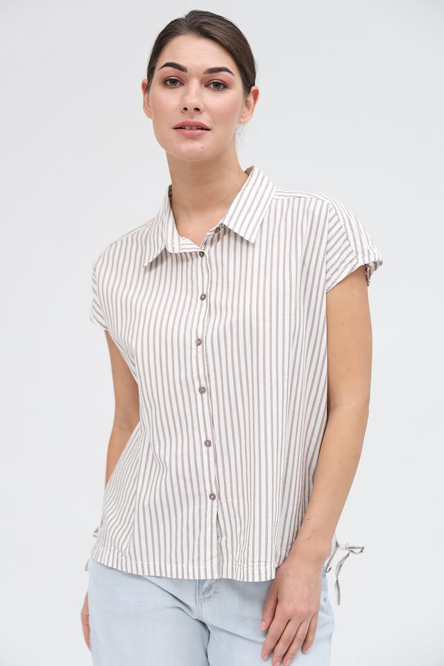 Женская рубашка Broadway бежевого цвета в полоску с коротким рукавом. Изготовлена из хлопка и вискозы, имеет завязки по бокам для регулировки посадки. Состав: хлопок 55%, вискоза 45%