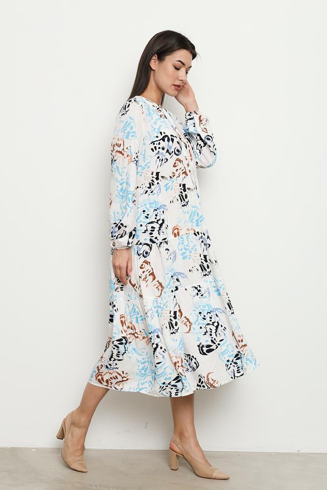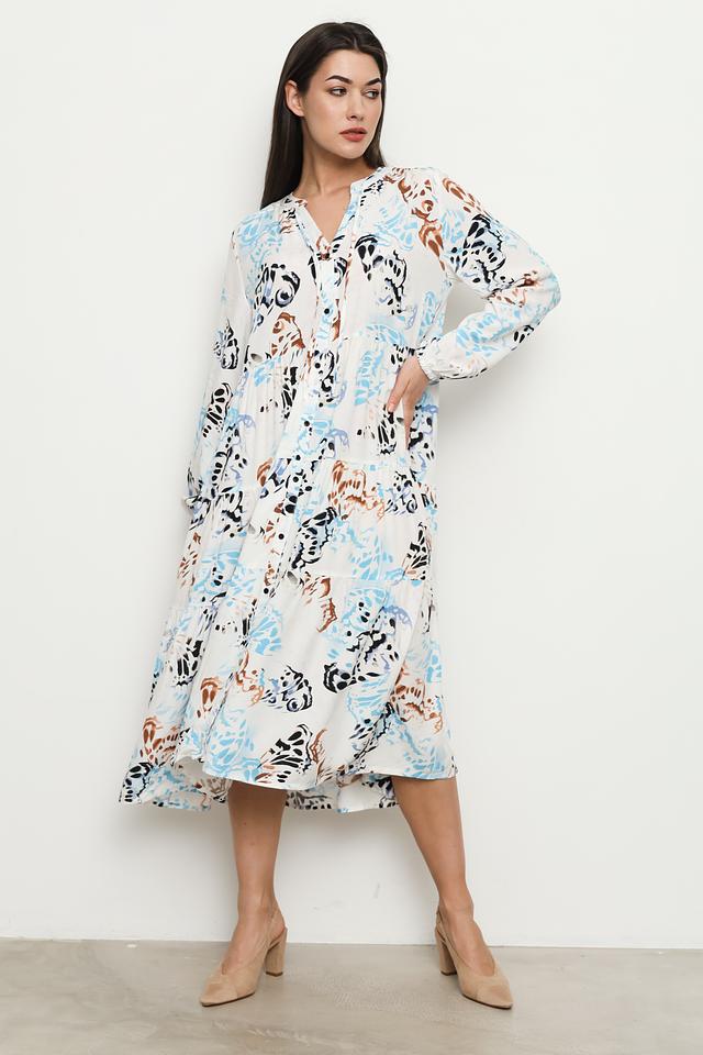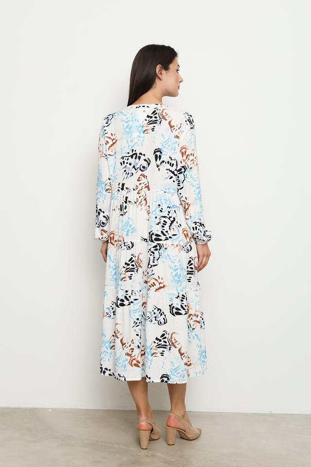Платье имеет свободный крой, который не сковывает движений. V-образный вырез горловины и длинные рукава с манжетами придают образу элегантность. Многослойная юбка добавляет платью объём и лёгкость.