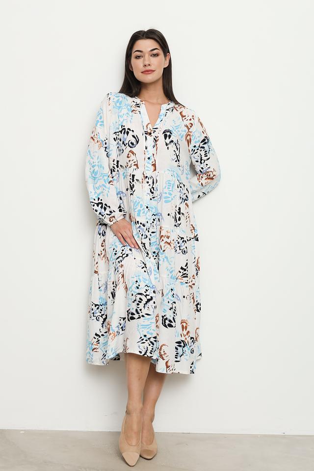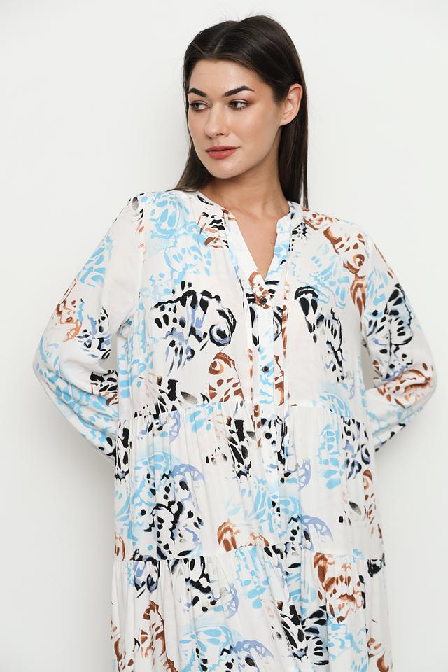 Особенностью этого платья является яркий и оригинальный принт, выполненный в бело-голубой и коричневой гамме. Это платье идеально подходит для повседневной носки, а также для особых случаев. Оно легко сочетается с различными аксессуарами и обувью.