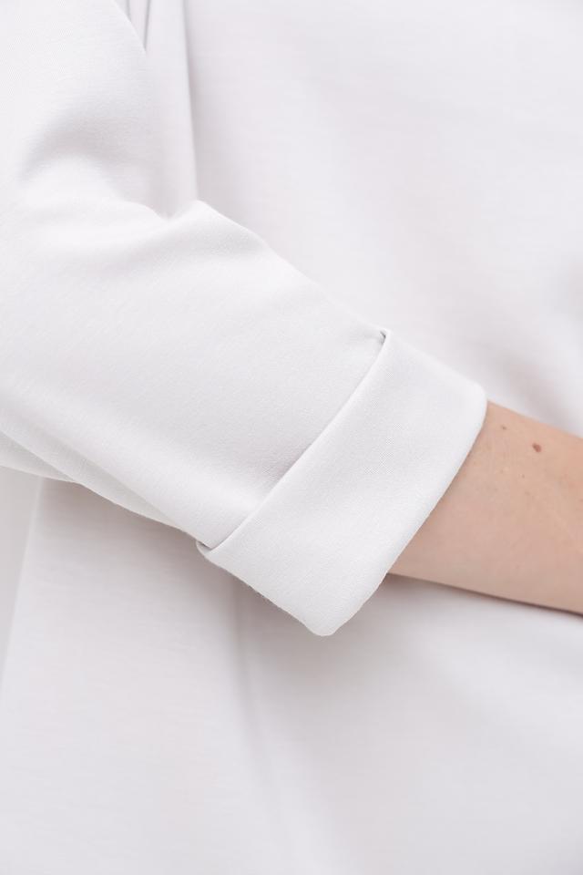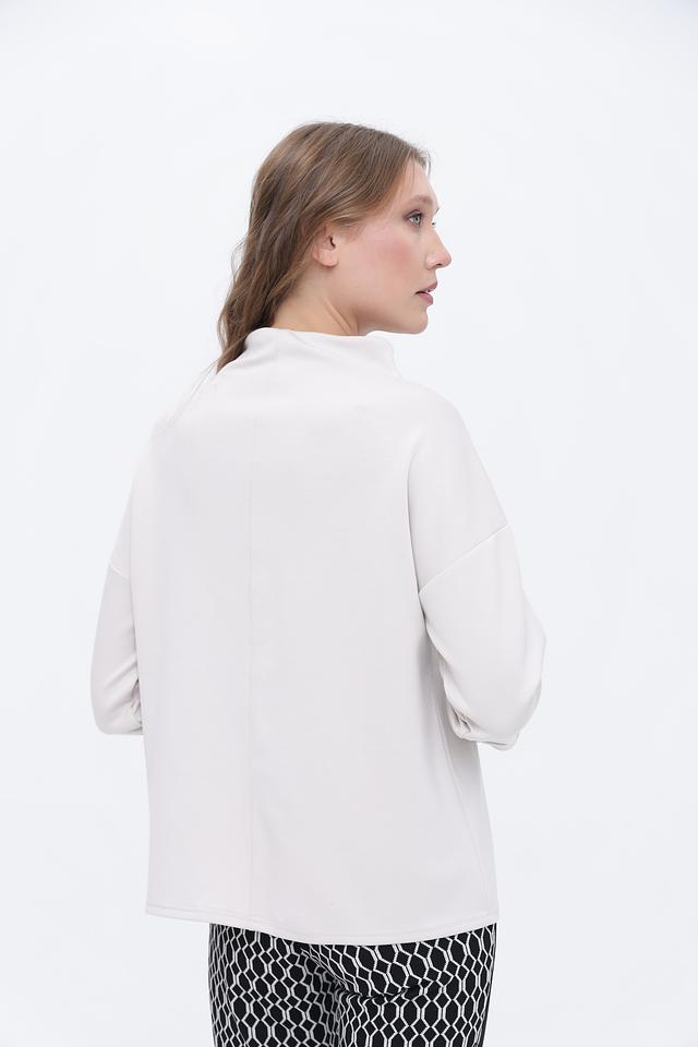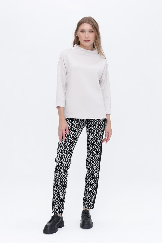 Модель имеет удобный крой с рукавом 3/4 и воротником-стойкой, что делает его универсальным для создания как повседневных, так и более элегантных образов. Ткань пуловера состоит из полиэстера, вискозы и эластана, что обеспечивает комфорт при носке, хорошую посадку по фигуре и устойчивость к деформации.