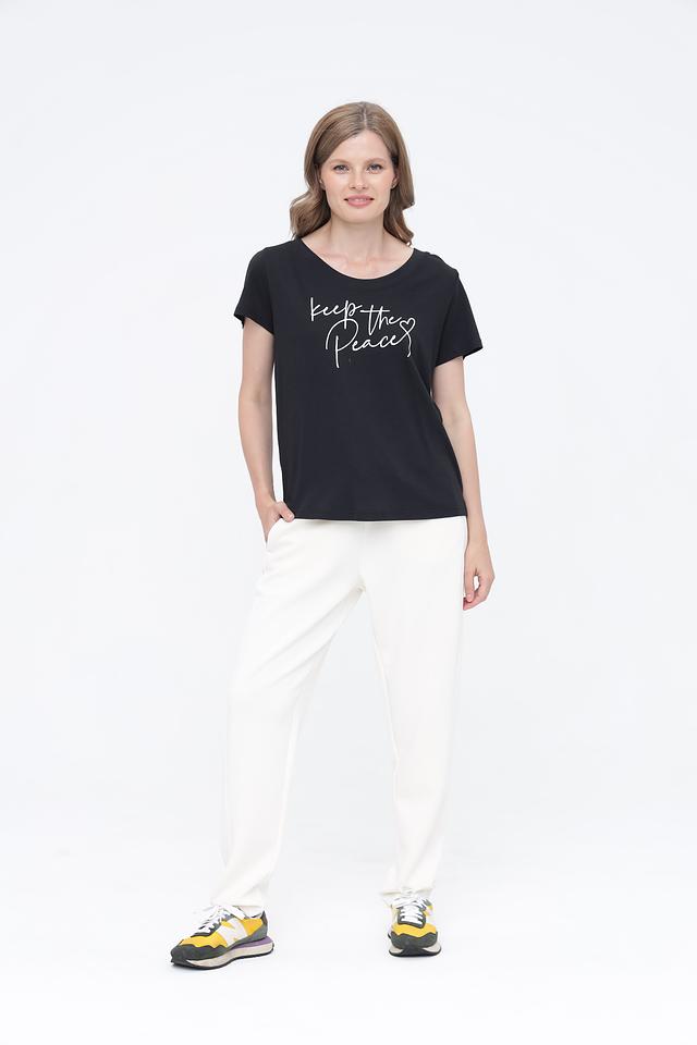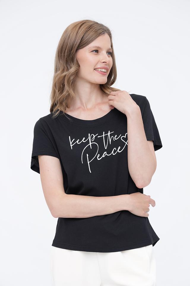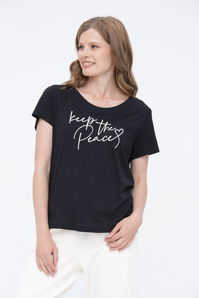 Чёрная футболка от Broadway с оригинальным белым принтом "Keep the Peace". Изготовлена из мягкой и приятной к телу ткани на основе вискозы и хлопка, обеспечивающей комфорт в носке. Состав: вискоза 50%, хлопок 50%