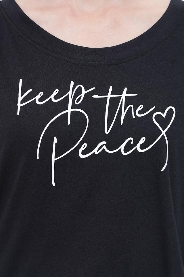 Эта стильная футболка от бренда Broadway станет отличным дополнением к вашему гардеробу. Она выполнена в классическом чёрном цвете и украшена эффектным белым принтом с надписью "Keep the Peace".