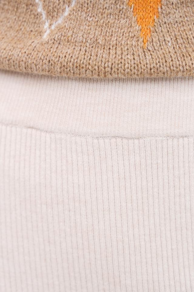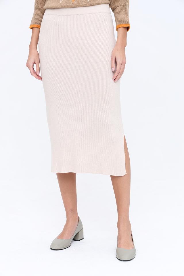 Юбка имеет классический бежевый цвет, который легко сочетается с различными элементами одежды. Трикотажная текстура добавляет изделию мягкости и уюта. Модель выполнена с разрезом сзади, что придает ей более современный и динамичный вид.