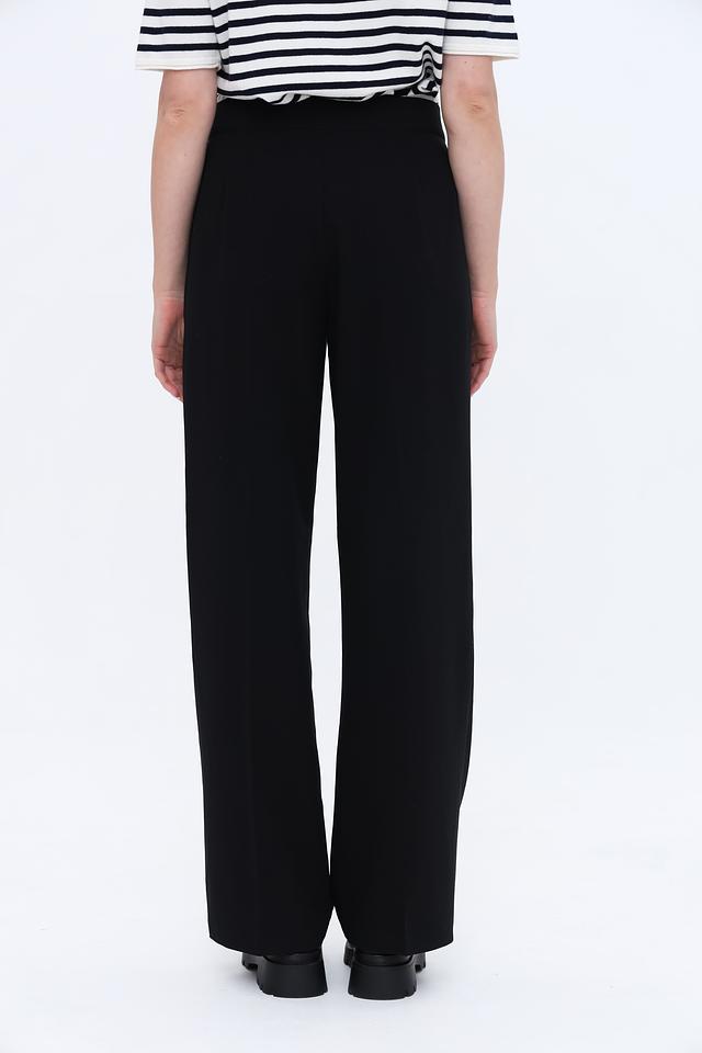 Брюки имеют высокую посадку и свободный крой, который визуально удлиняет ноги и создаёт силуэт в стиле ретро. Застёжка на молнии и пуговице обеспечивает надежную фиксацию. Ткань, состоящая из полиэстера, вискозы и эластана, приятна к телу, хорошо держит форму и практически не мнется.