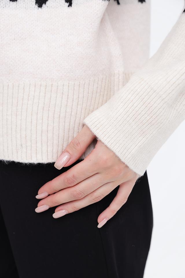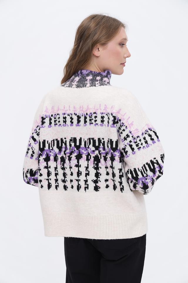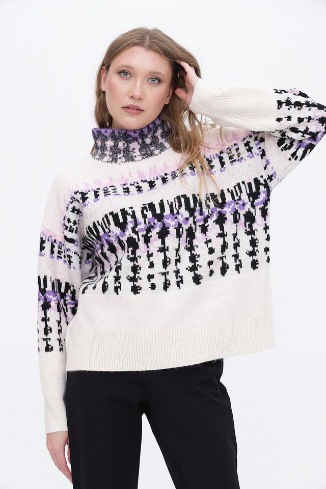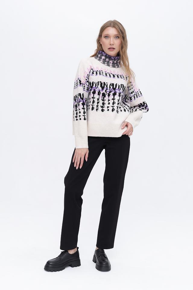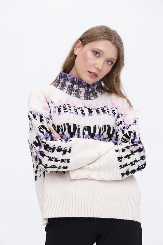 Пуловер имеет свободный крой и высокий воротник-стойку, что делает его универсальным для различных случаев. Бежевый цвет с ярким лиловым узором добавляет изделию оригинальности и привлекательности.