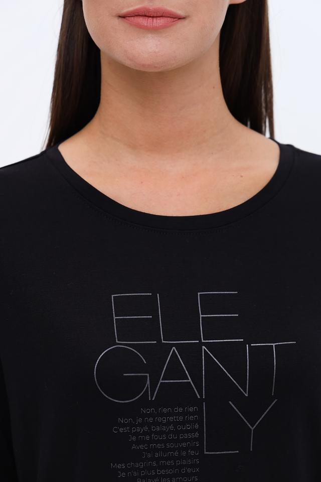 Лонгслив имеет прямой крой и удобную посадку по фигуре. На лицевой стороне расположен эффектный принт с надписью "ELEGANTLY", выполненный в контрастных тонах. Длинные рукава обеспечивают дополнительное тепло в прохладную погоду.