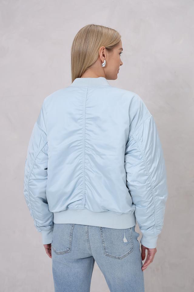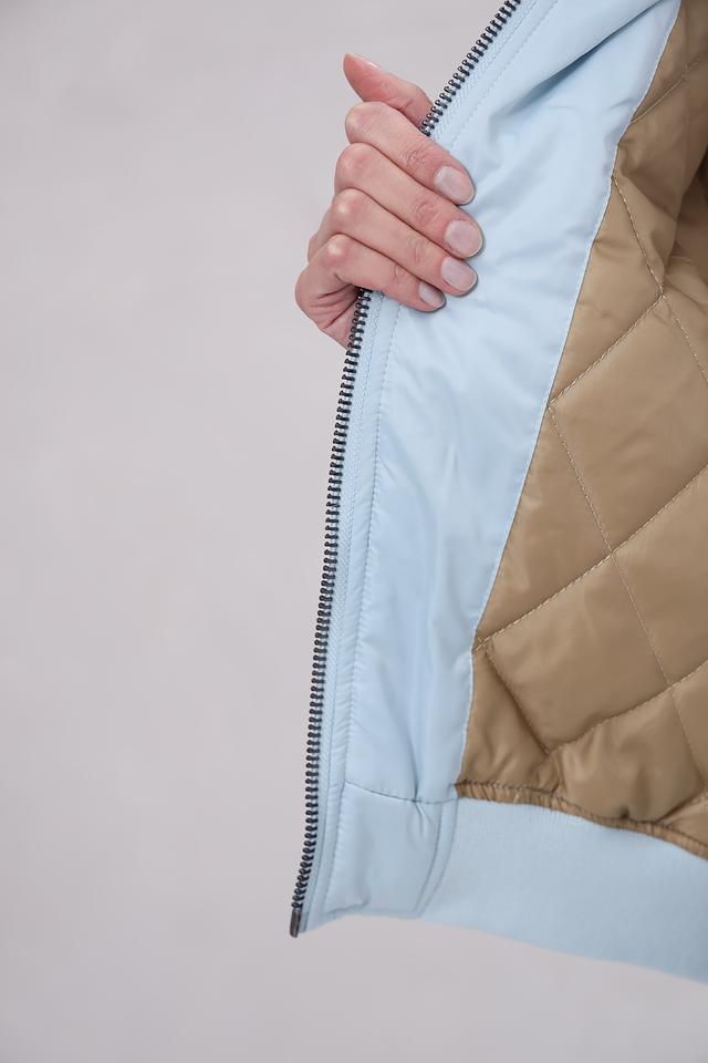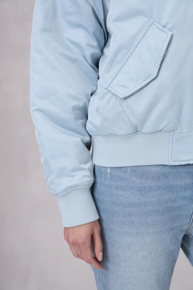 Куртка-бомбер застегивается на молнию, имеет воротник-стойку и боковые карманы. Рукава куртки слегка спущены, что придает ей более расслабленный вид. Материал верха – 100% полиэстер, что обеспечивает легкость и практичность в уходе.