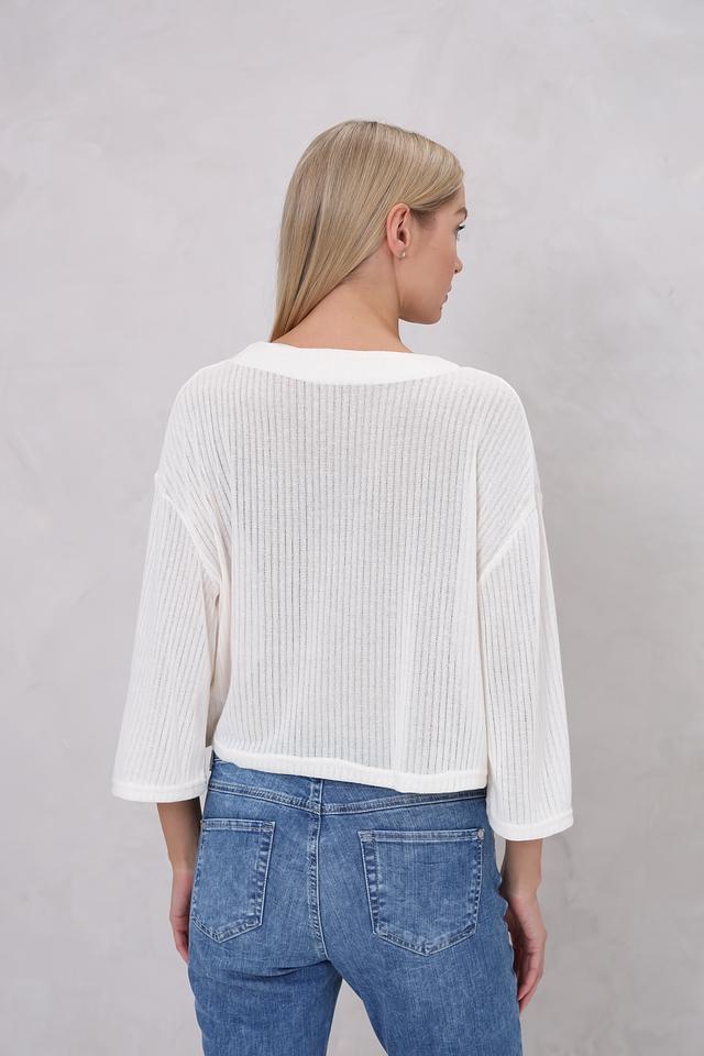 Жакет имеет укороченный крой и V-образный вырез, что визуально вытягивает силуэт. Рукава 3/4 придают образу лёгкость и непринуждённость. Застёжка выполнена на ряд пуговиц в тон изделию.