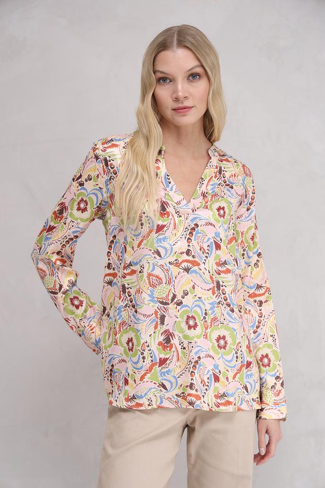 Особенностью этой блузы является её яркий и красочный цветочный принт, который состоит из множества оттенков: зелёного, голубого, оранжевого, коричневого и розового. Такой рисунок делает блузу уникальной и привлекательной. Состав ткани: 55% полиэстер, 45% вискоза.