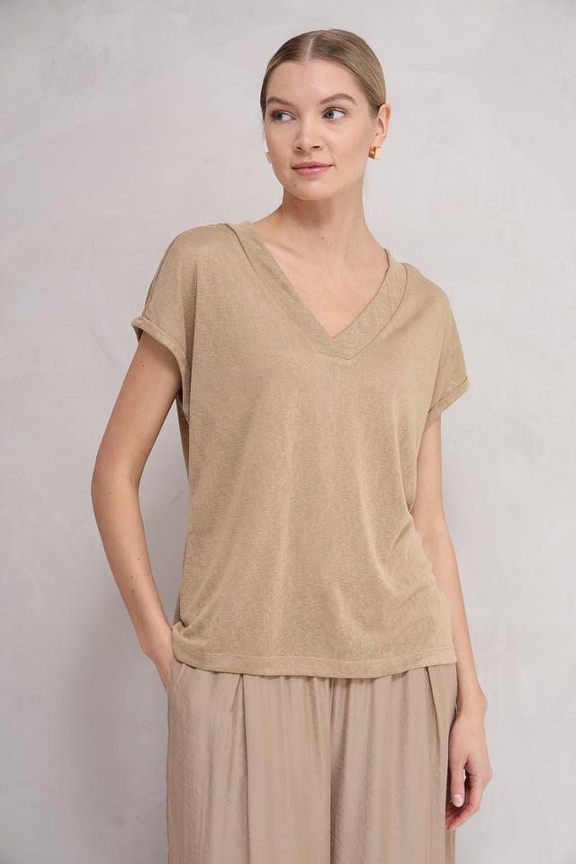 Топ имеет классический V-образный вырез, который визуально удлиняет шею и подчеркивает линию декольте. Короткие рукава делают его идеальным выбором для теплой погоды. Свободный крой обеспечивает комфорт и свободу движений.