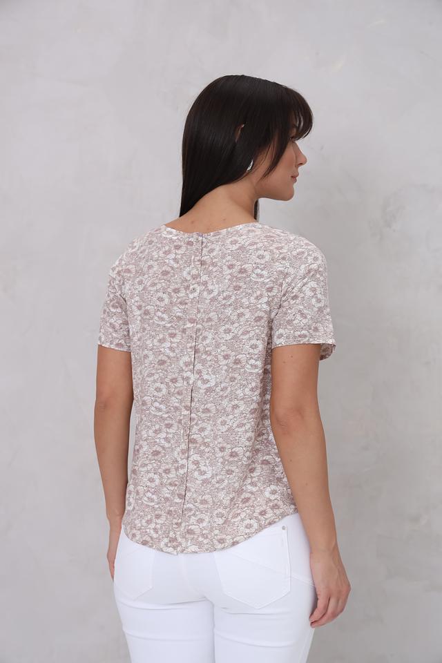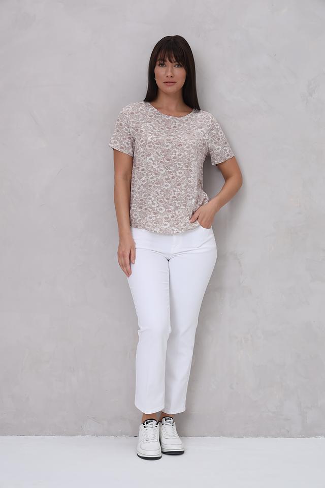 Блуза имеет прямой крой, короткие рукава и округлый вырез горловины. Легкая и воздушная ткань идеально подходит для теплой погоды. Эта модель прекрасно сочетается с белыми брюками или джинсами, создавая непринужденный и элегантный образ.
