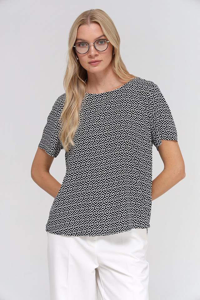 Блуза имеет прямой крой, короткие рукава и круглый вырез горловины. Она прекрасно сочетается с брюками, юбками и джинсами, позволяя создавать разнообразные комплекты для работы, отдыха или особых случаев.
