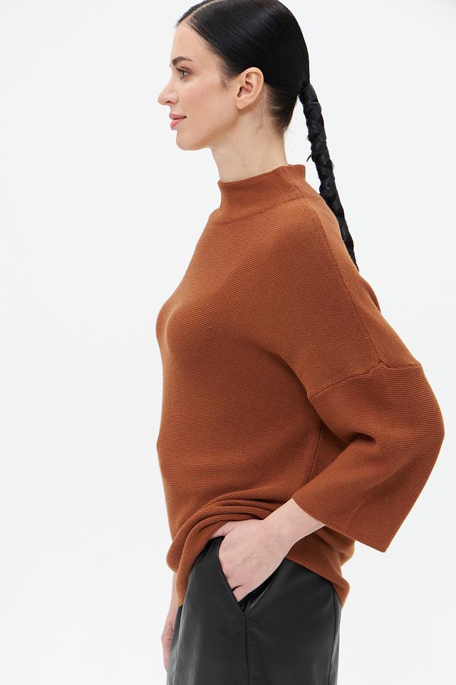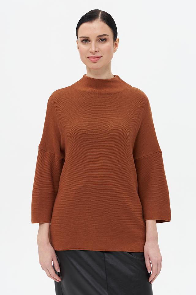 Пуловер имеет прямой крой, воротник-стойку и рукав три четверти, что придает ему современный и элегантный вид. Кофейный цвет изделия легко сочетается с различными элементами одежды, позволяя создавать разнообразные образы.