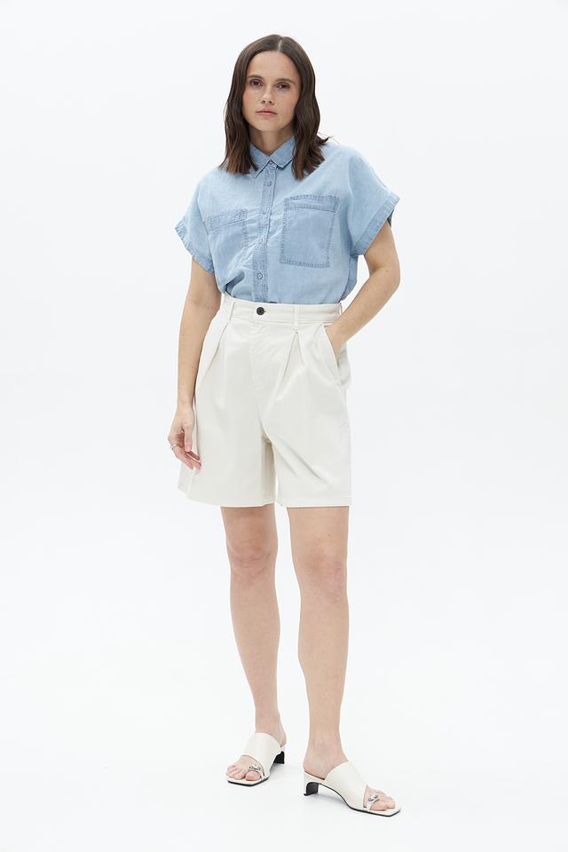 Блуза имеет прямой крой, короткие рукава и классический отложной воротник. На груди расположены два накладных кармана, добавляющие образу непринужденность. Застежка на пуговицах по всей длине позволяет регулировать степень прилегания.