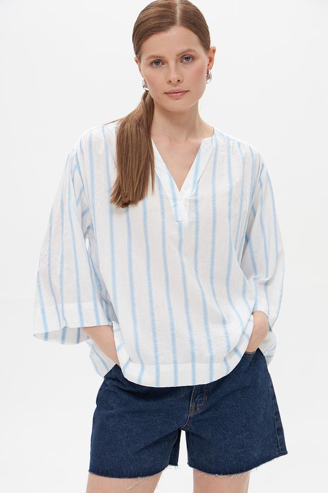 Вертикальная полоска голубого цвета на белом фоне делает эту блузу универсальной и подходящей для различных стилей. Она легко сочетается с джинсами, брюками или юбками.
