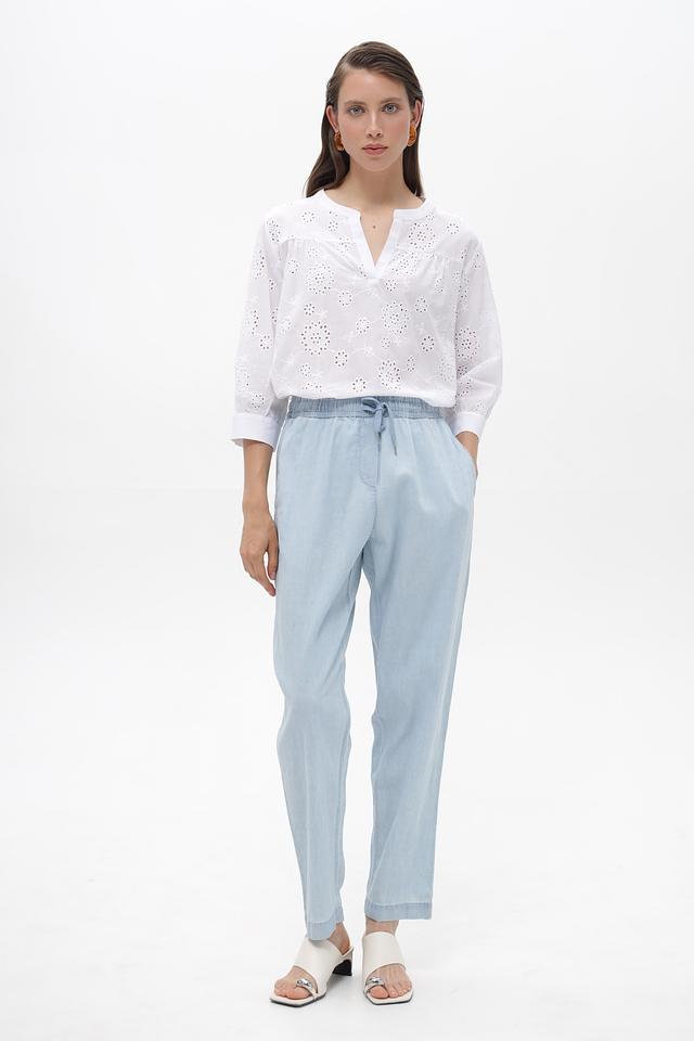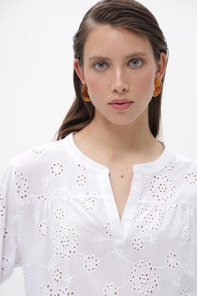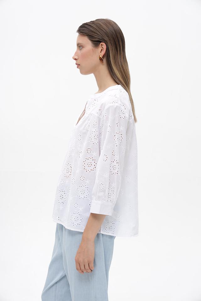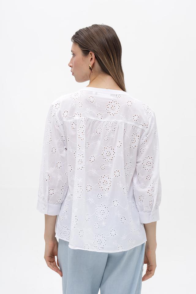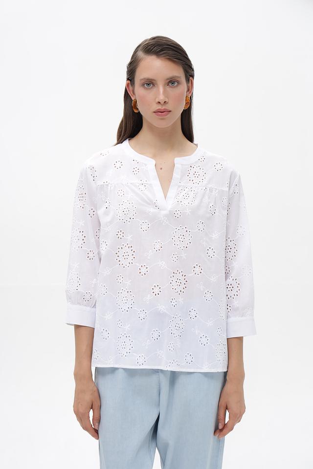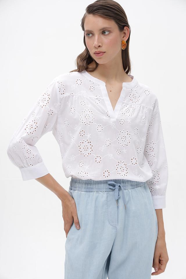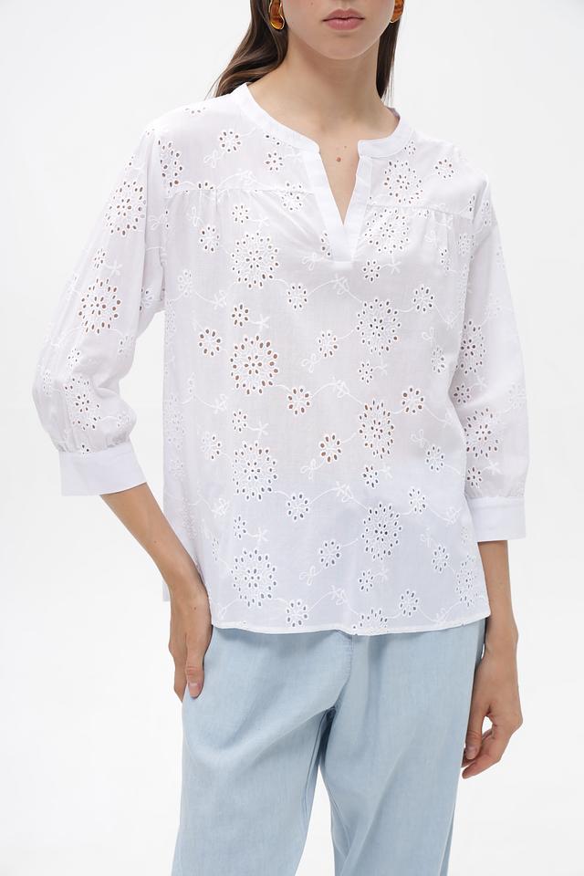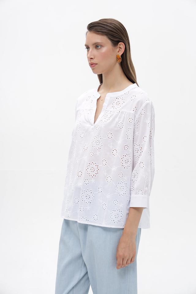 Особенностью модели является деликатная вышивка "ришелье", которая придает ей изысканность и неповторимый шарм. V-образный вырез горловины и короткие рукава с манжетами добавляют блузе женственности.