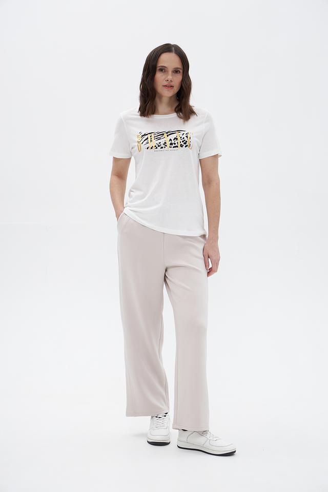 Основной цвет футболки – белый, что делает ее универсальной и легко сочетаемой с различными элементами одежды. Главной особенностью данной модели является яркий и запоминающийся принт, выполненный в анималистичном стиле. Принт сочетает в себе элементы зебры и леопарда, выполненные в черном и золотистом цветах, что придает футболке оригинальность и индивидуальность.