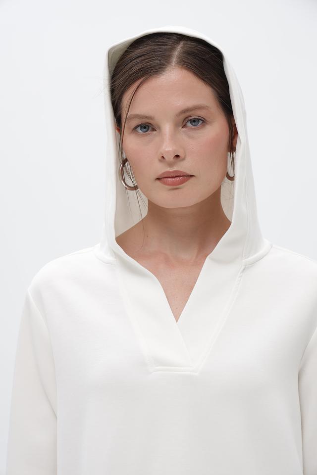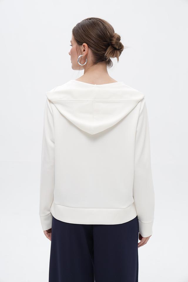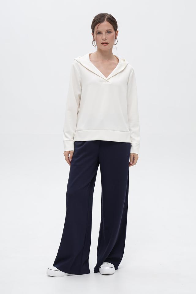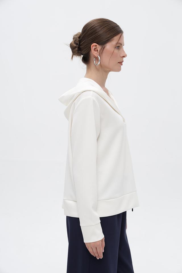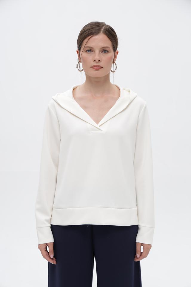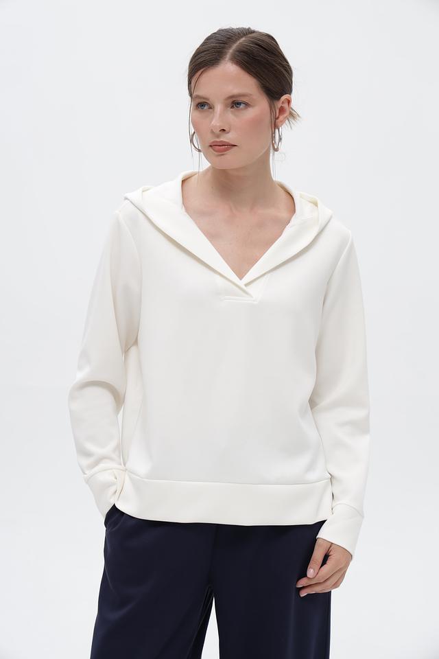 Женский пуловер Broadway молочного цвета с капюшоном и V-образным вырезом. Изготовлен из мягкой ткани с добавлением вискозы и эластана для комфорта и хорошей посадки. Состав: полиэстер 50%, вискоза 45%, эластан 5%