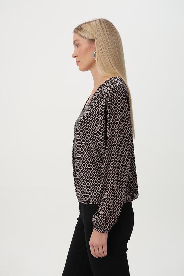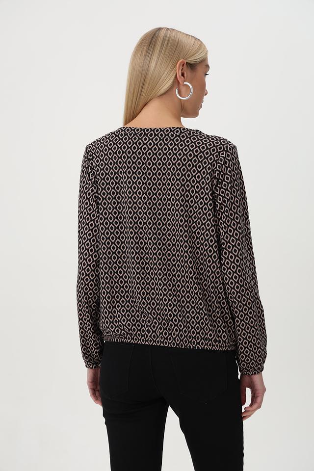 Блузка имеет классический V-образный вырез и длинные рукава с манжетами. Её особенностью является оригинальный геометрический принт в чёрно-белой гамме, который придаёт ей элегантный и современный вид.