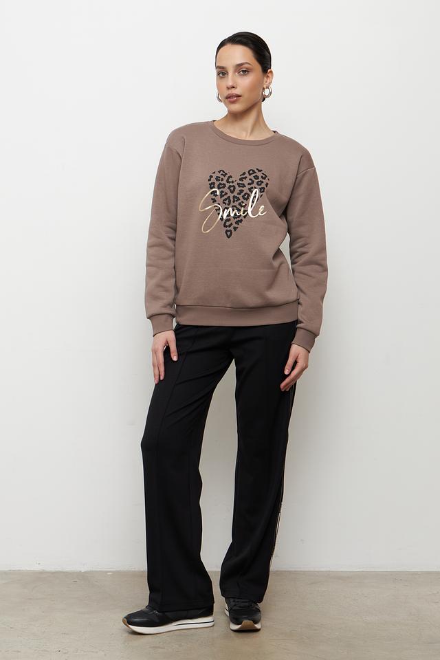 Этот стильный пуловер от Broadway станет отличным дополнением к вашему гардеробу. Пуловер выполнен в приятном бежевом цвете и украшен ярким принтом в виде сердца, заполненного леопардовым узором, с надписью "Smile".
