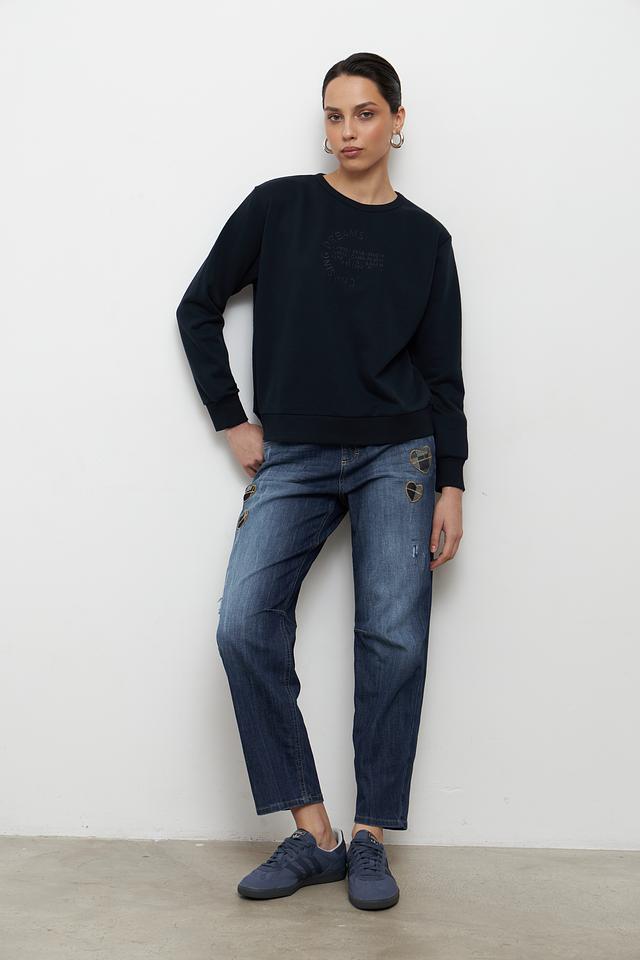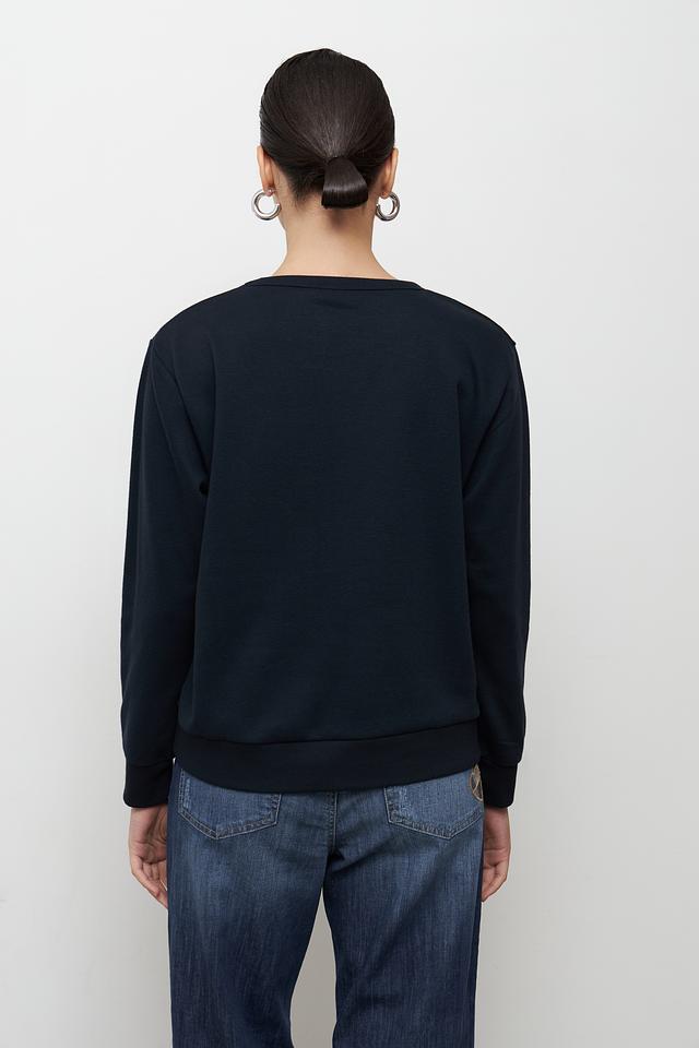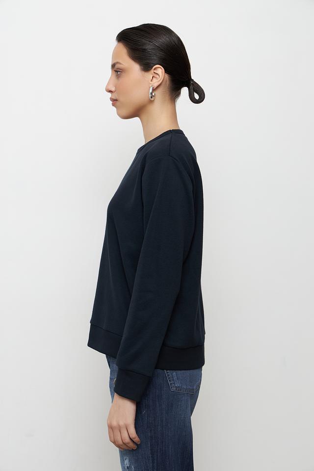 Пуловер имеет классический чёрный цвет и свободный крой, который позволяет создать расслабленный и непринужденный образ. Круглый вырез горловины делает его универсальным для различных стилей.