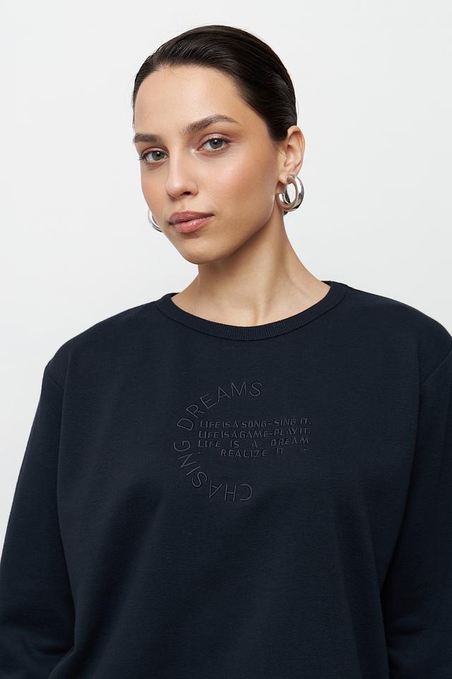 Особенностью данного пуловера является оригинальный принт с надписью, который добавляет индивидуальности и выразительности. Этот пуловер идеально подойдет для повседневной носки, прогулок или встреч с друзьями. Он легко сочетается с джинсами, брюками или юбками.
