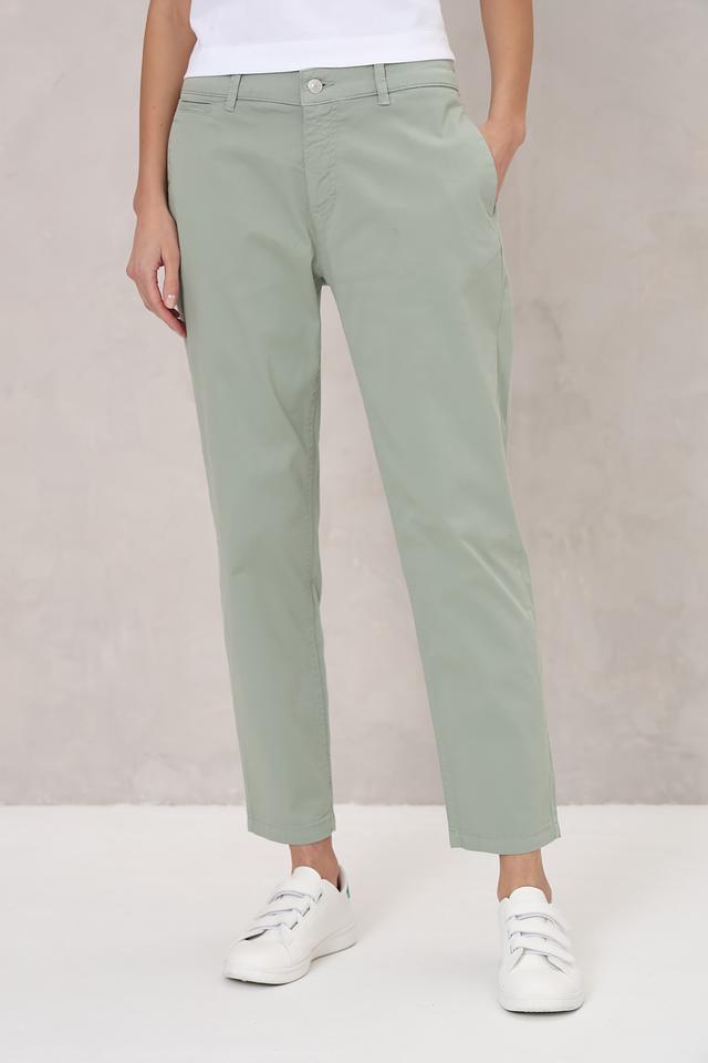 Нежный мятный цвет брюк легко сочетается с различными элементами одежды, позволяя создавать разнообразные образы — от повседневных до более элегантных. Состав ткани: 97% хлопок, 3% эластан.