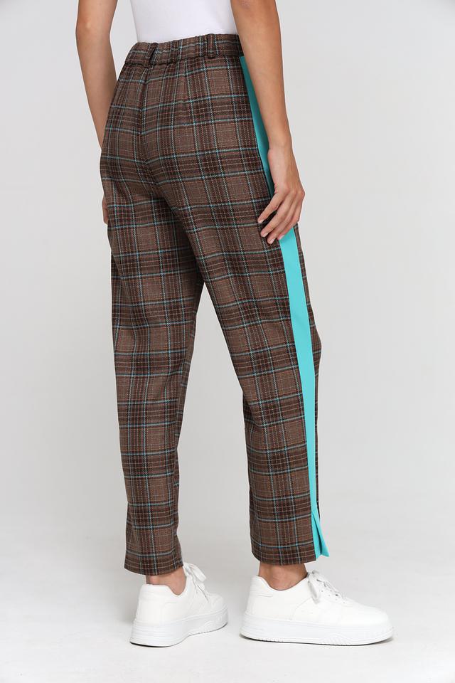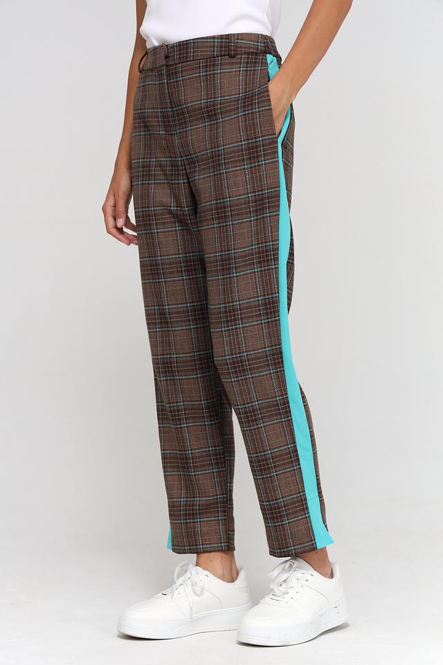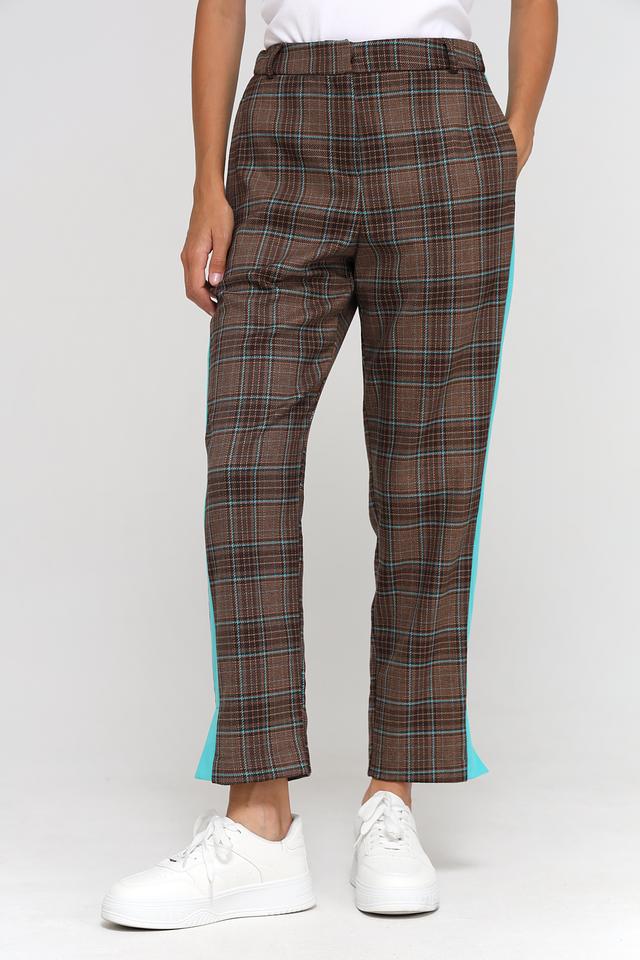 Женские брюки Beatris коричневого цвета в клетку с яркой бирюзовой полосой по бокам. Модель выполнена из мягкой ткани с добавлением вискозы и эластана для комфорта и свободы движений. Состав: полиэстер 64%, вискоза 34%, эластан 2%