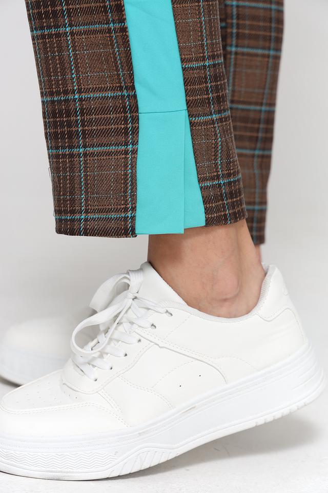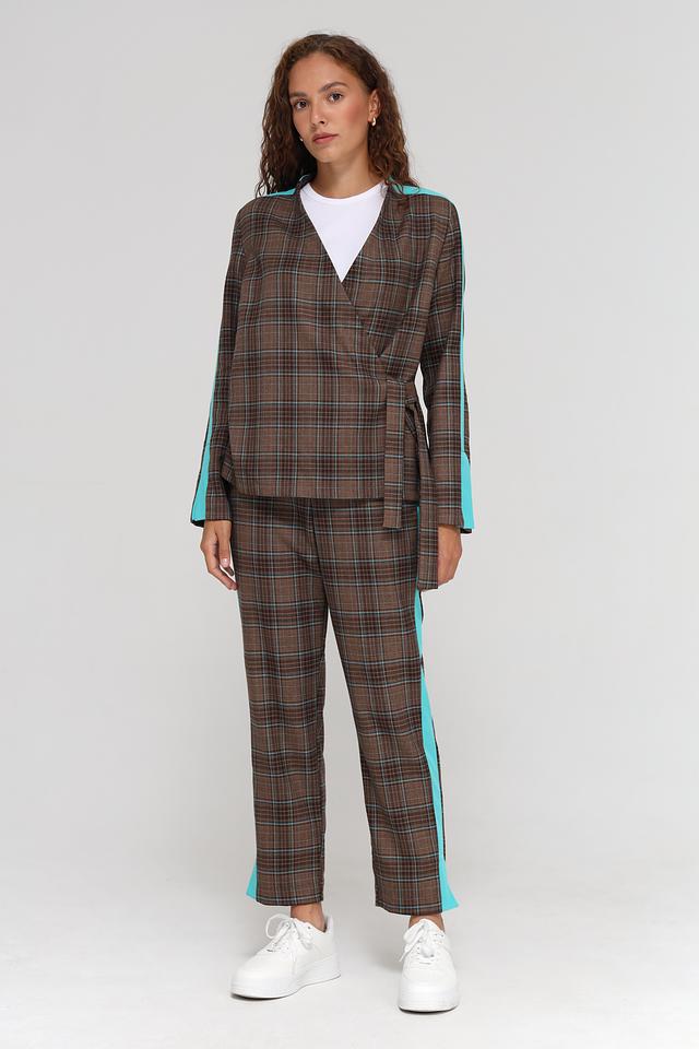 Основной цвет брюк – коричневый, но благодаря оригинальному клетчатому принту, они выглядят очень интересно и необычно. Яркая бирюзовая полоса, проходящая по боковой части штанин, добавляет образу динамичности и акцента.