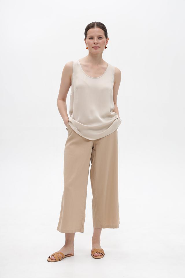 Брюки имеют свободный крой и укороченную длину, что делает их идеальными для летнего сезона. Высокая посадка подчеркивает талию и визуально удлиняет ноги. Классический пояс с петлями для ремня обеспечивает удобную посадку.
