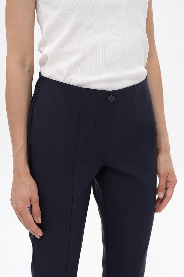 Брюки имеют узкий крой и слегка зауженный силуэт, подчеркивающий фигуру. Пояс на пуговице и аккуратные стрелки придают им элегантный и лаконичный вид.