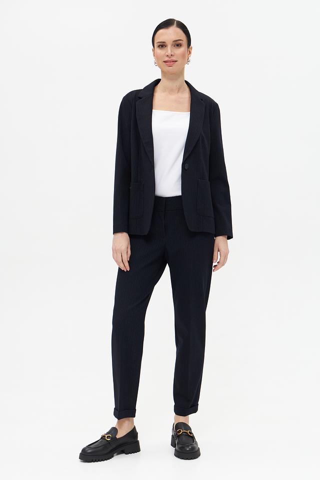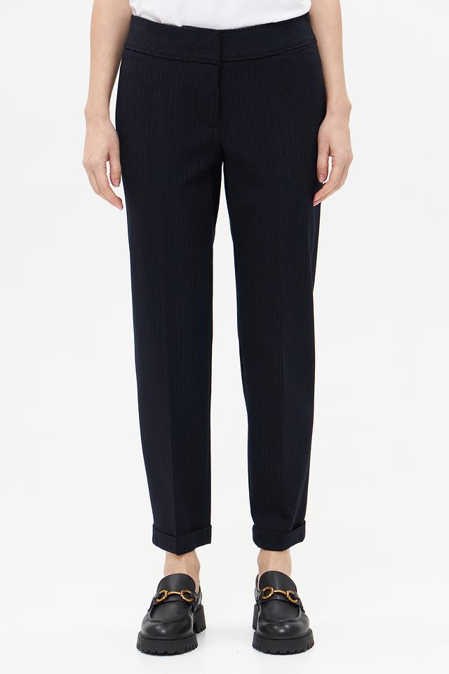 Представляем элегантные брюки от бренда Bianca, выполненные в классическом черном цвете с деликатной вертикальной полоской. Эта модель станет отличным дополнением к вашему гардеробу, позволяя создавать разнообразные образы – от деловых до повседневных.