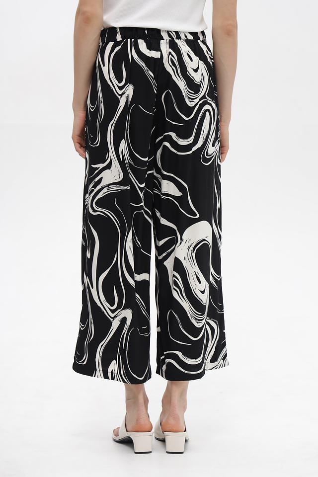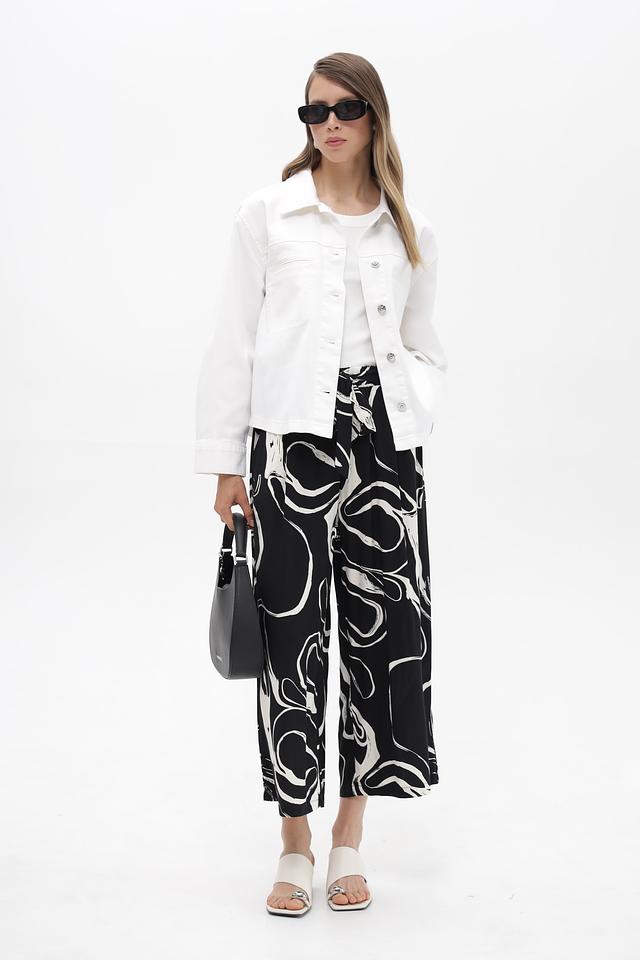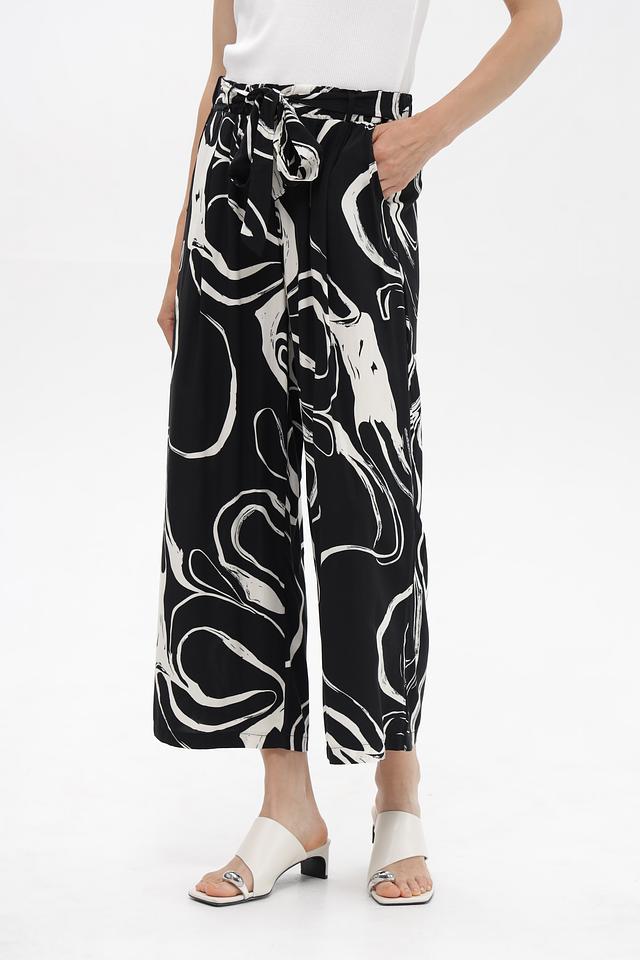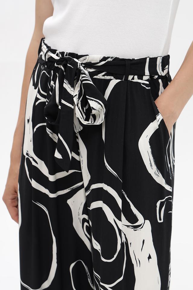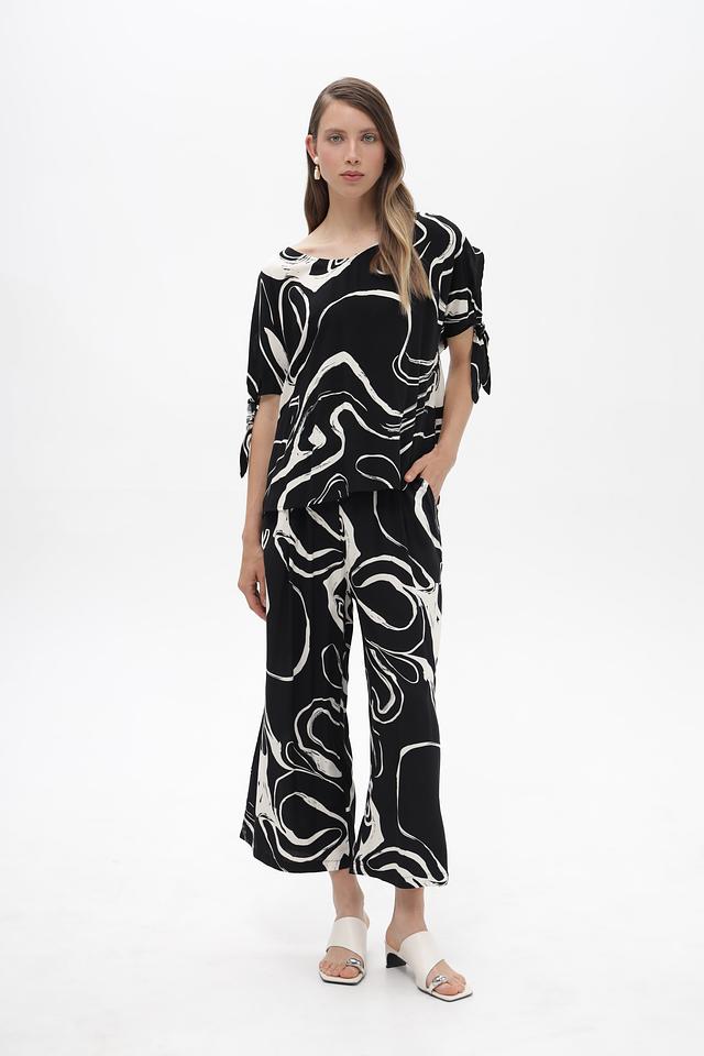 Брюки имеют выразительный чёрный цвет, украшенный абстрактным принтом, который придает им современный и оригинальный вид. Пояс на завязках позволяет регулировать посадку и подчеркивает талию.
