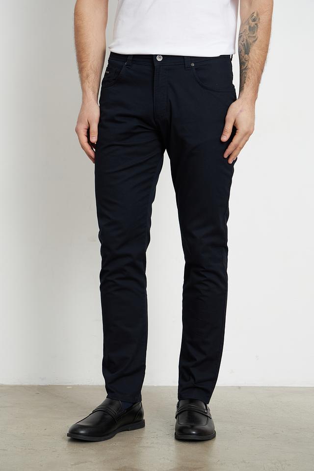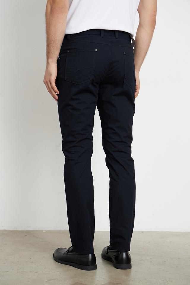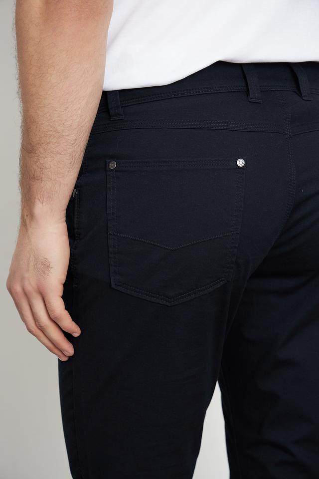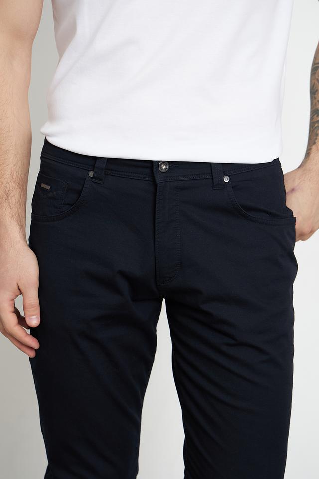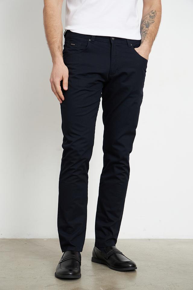 Брюки выполнены из высококачественного хлопка с добавлением эластана, что придает им мягкость, комфорт и небольшую эластичность. Ткань приятна на ощупь и хорошо держит форму. Цвет брюк – насыщенный темно-синий, который легко сочетается с различными элементами гардероба.