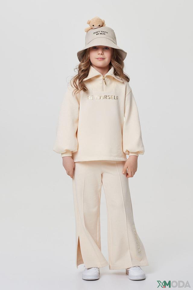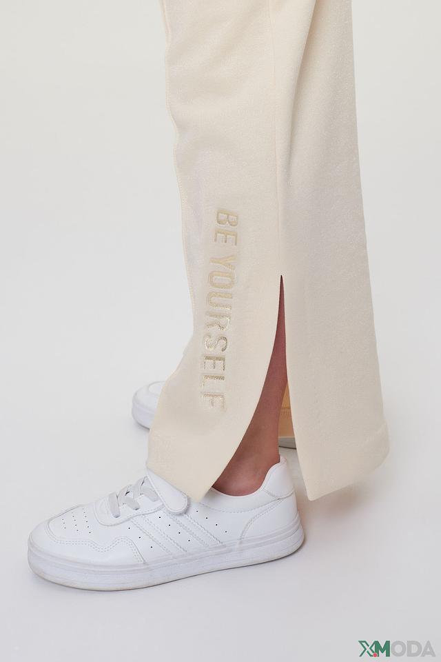 Брюки имеют прямой крой и широкие штанины, обеспечивающие свободу движений. На штанинах расположена стильная надпись "BE YOURSELF", добавляющая образу индивидуальность.