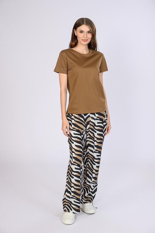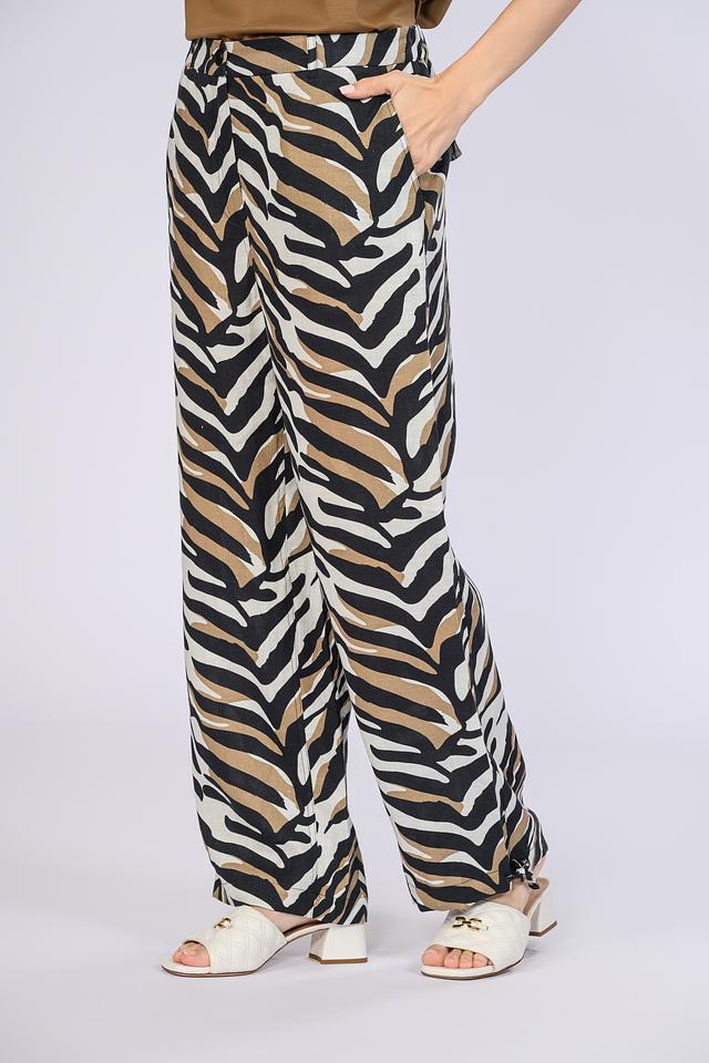 Особенностью этих брюк является яркий принт "зебра", выполненный в сочетании черного, бежевого и коричневого цветов. Боковые карманы добавляют функциональности и практичности. Данная модель идеально подойдет для создания модных и стильных образов в повседневной жизни.