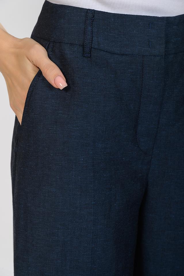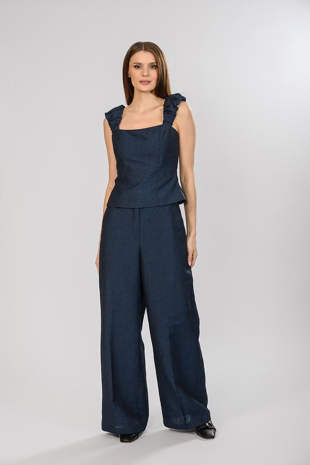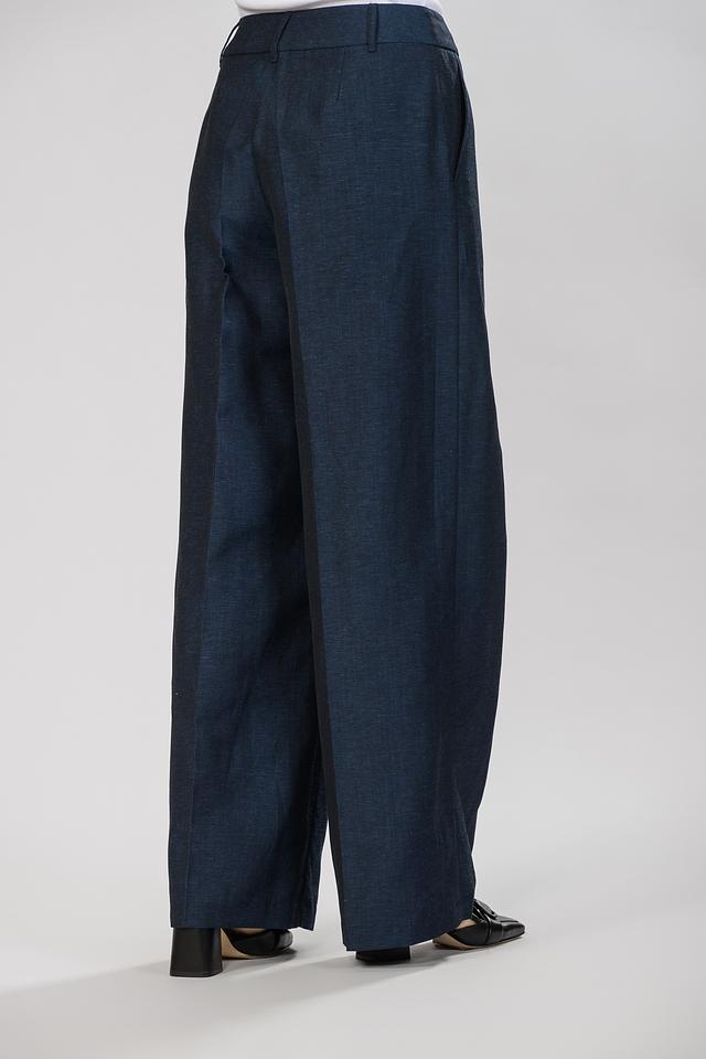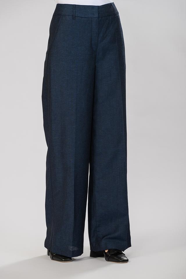 Брюки имеют широкий крой, который обеспечивает свободу движений и комфорт в носке. Высокая посадка визуально удлиняет ноги и подчеркивает талию. Классический тёмно-синий цвет легко сочетается с различными элементами одежды и аксессуарами.