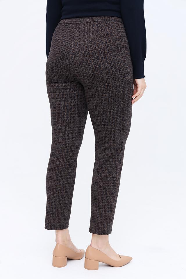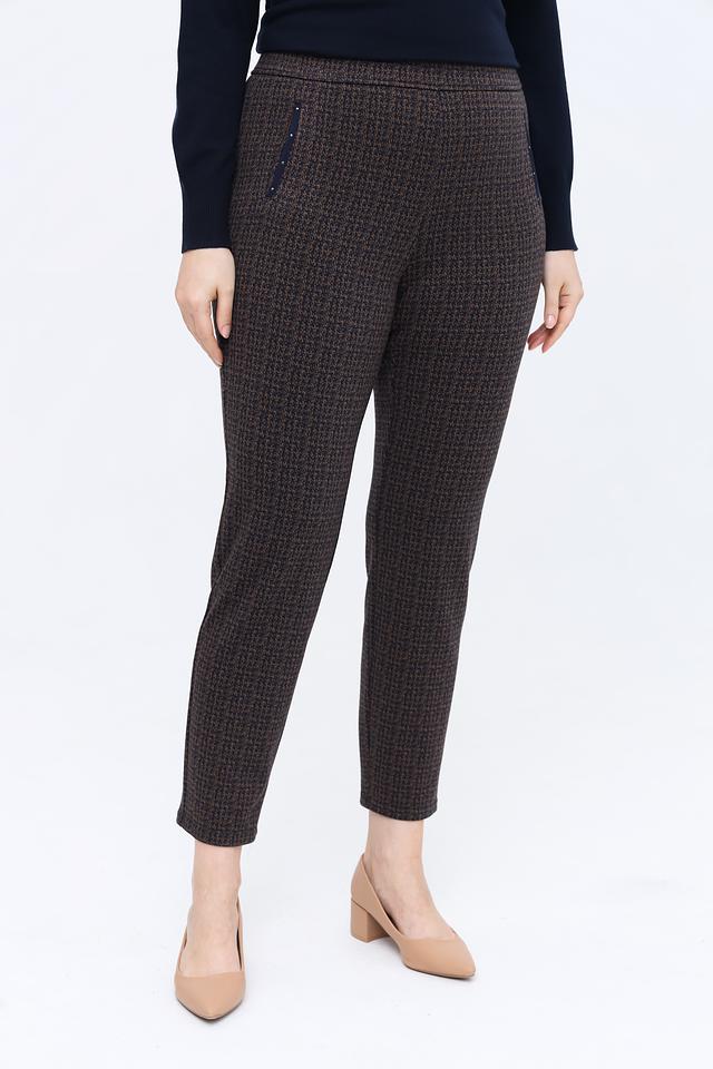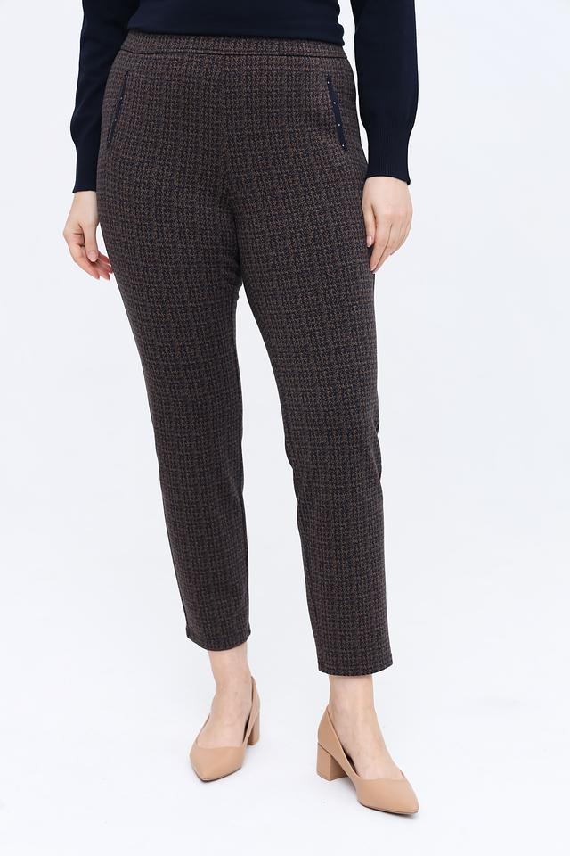Женские брюки Frank Walder коричневого цвета с клетчатым принтом и удобным эластичным поясом. Модель выполнена из мягкой ткани с добавлением вискозы и полиэстера, обеспечивающей комфорт и практичность. Состав: полиэстер 57%, вискоза 30%, полиамид 11%, эластан 2%