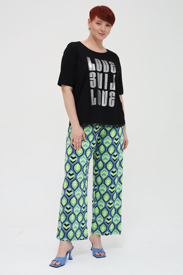 Брюки отличаются оригинальным геометрическим принтом в сине-зелёной гамме, который придаёт им неповторимый стиль. Прямой крой и широкие штанины делают их универсальными и подходящими для различных типов фигуры.