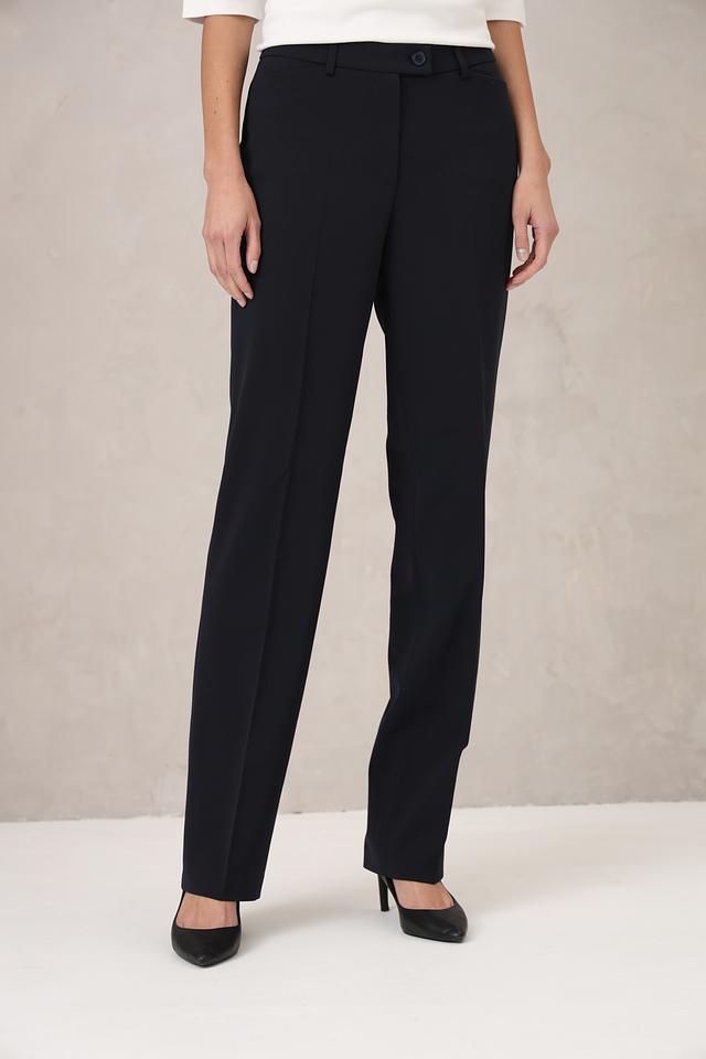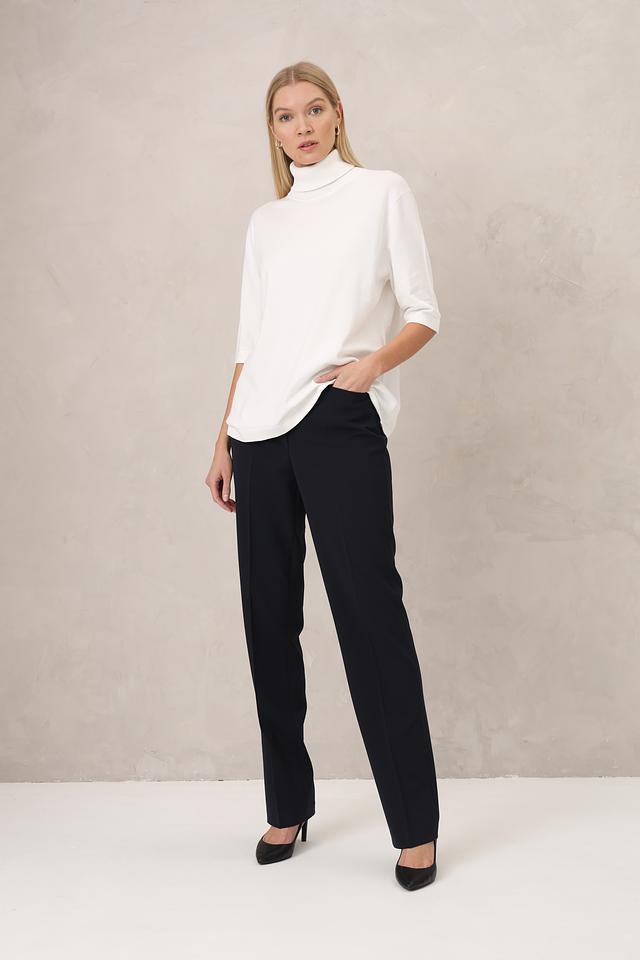 Брюки имеют прямой крой, который обеспечивает комфортную посадку и свободу движений. Ткань, состоящая из полиэстера, шерсти и эластана, приятна на ощупь, хорошо держит форму и практически не мнется.
