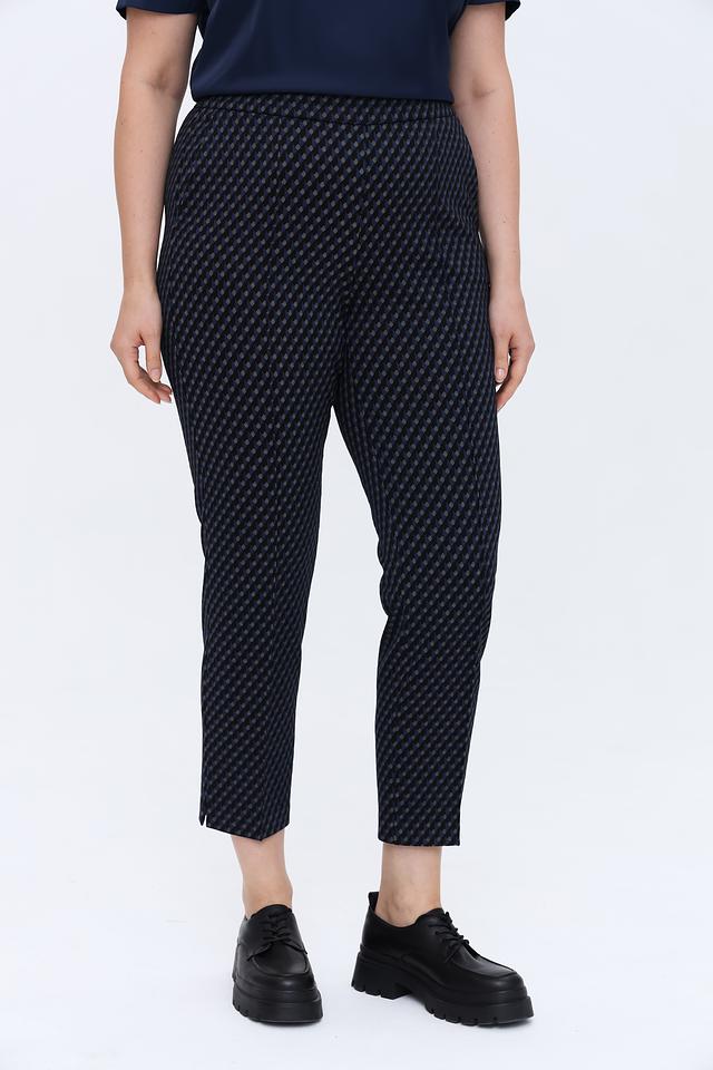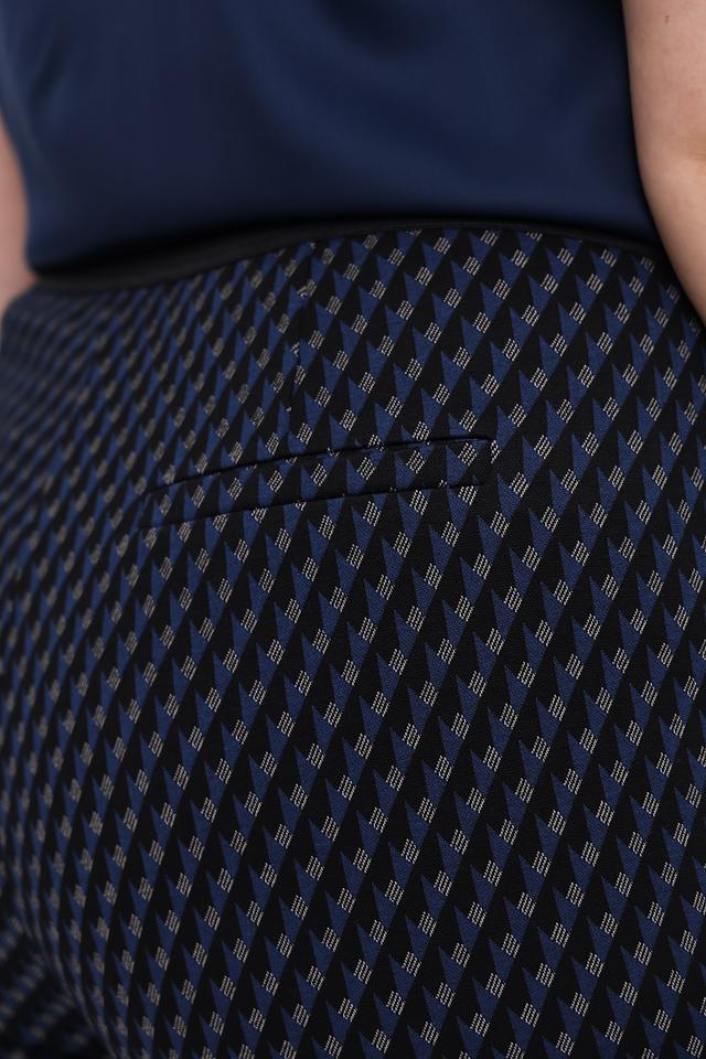Темно-синий цвет и оригинальный геометрический принт делают эти брюки универсальными и подходящими для различных образов. Прямой крой обеспечивает свободу движений, а эластан в составе ткани гарантирует отличную посадку по фигуре.