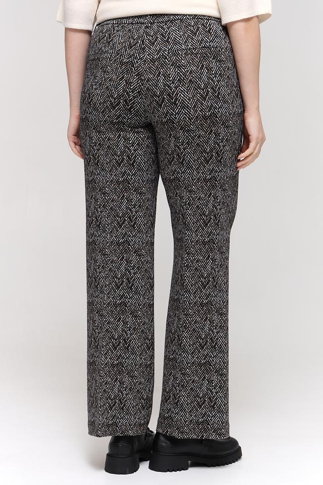 Основной цвет брюк – чёрный, но благодаря оригинальному геометрическому принту в белых и светло-серых тонах, они выглядят очень эффектно и современно. Принт выполнен в виде мелкой клетки, которая визуально стройнит фигуру.