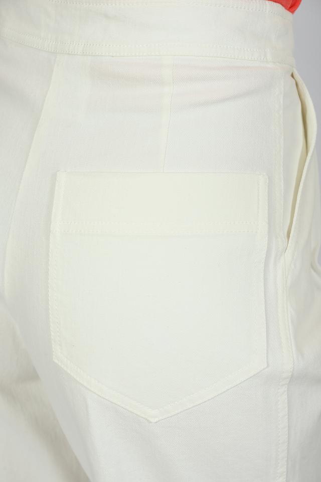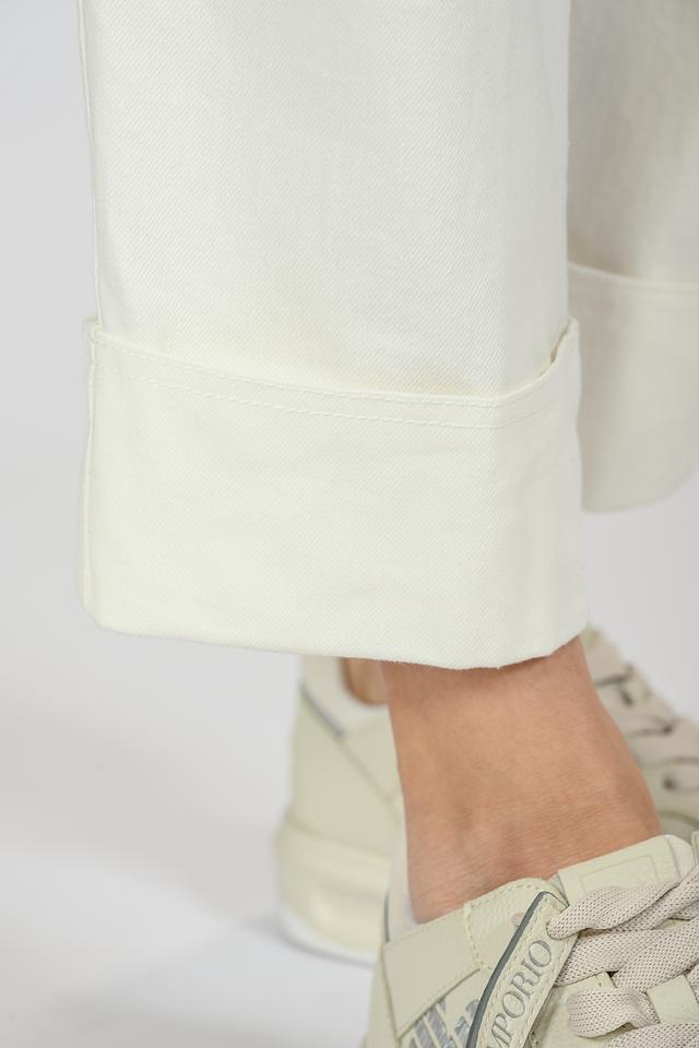 Брюки имеют прямой крой и завышенную талию, что визуально удлиняет ноги и подчеркивает фигуру. Передняя часть брюк украшена аккуратными складками, добавляющими изысканности образу. Застежка на молнию и пуговицу обеспечивает надежную фиксацию. Классические боковые и задние карманы практичны и функциональны.