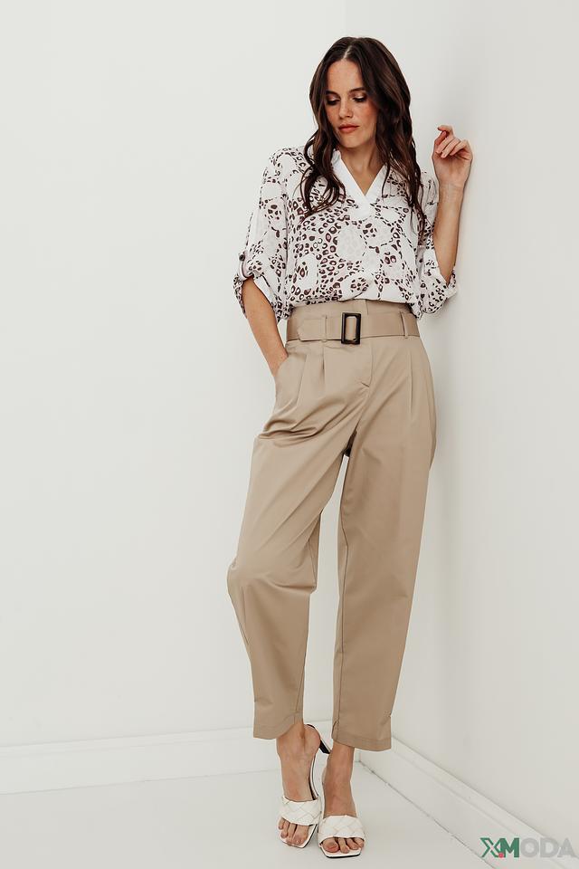 Особенностью модели является широкий пояс с элегантной пряжкой, который подчеркивает талию и добавляет образу изысканности. Застежка на пуговицы обеспечивает надежную фиксацию. Брюки имеют аккуратные складки спереди и манжеты по низу, которые придают им завершенный вид.