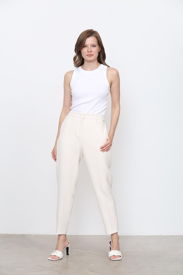Брюки имеют прямой крой, который подчеркивает фигуру и обеспечивает свободу движений. Застежка на молнию и пуговицу гарантирует надежную фиксацию. Модель дополнена боковыми карманами.