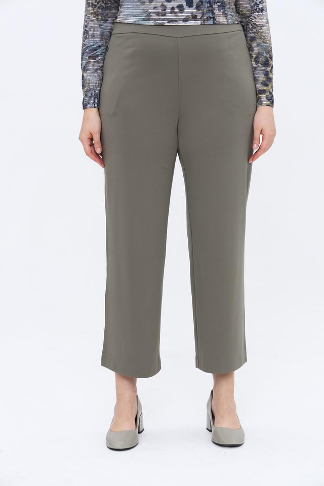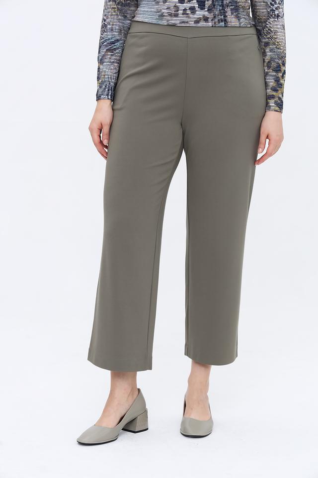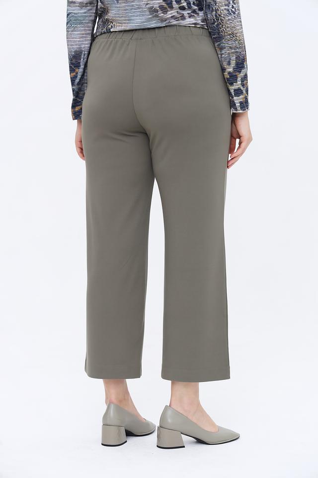 Брюки выполнены в спокойном цвете хаки, который легко сочетается с различными элементами одежды. Высокая посадка и эластичный пояс обеспечивают комфортную посадку по фигуре, а прямой крой визуально удлиняет ноги.
